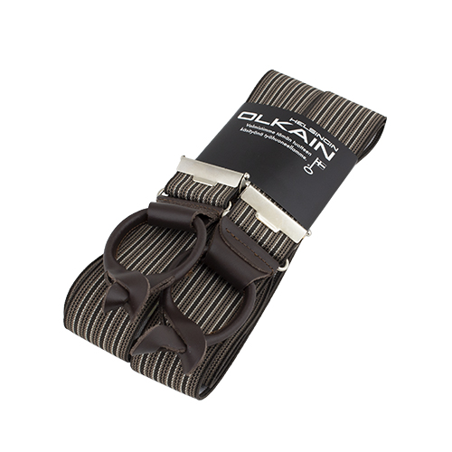 Button Suspenders 35 mm, Pinstripe, Brown. High-quality 35 mm wide suspenders from Helsingin Olkain feature a button attachment. Equipped with a lockable adjustment piece for customizable length.... Read more