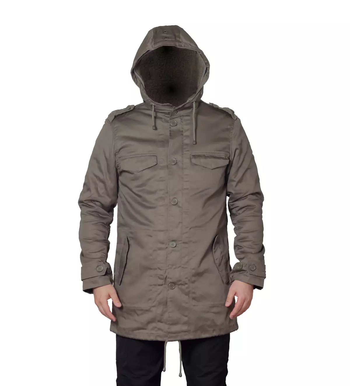 Brandit BW Parka Jacket, Forest, Olive Green. Brandit has created a stylish yet discreetly military-inspired replica of the Bundeswehr parka, featuring a removable faux fur lining. This parka jacket includes two button-flap side pockets, two button-flap chest pockets, and an inner pocket within the lining. The cuffs are adjustable with buttons, and both the hem and the hood have drawstring closures. The jacket features a spacious hood, also equipped with fur lining to keep your head warm. The faux fur lining is secured with both snaps and buttons. The jacket closes with a front zipper and includes a buttoned wind flap. The outer fabric is made from durable polyester, while the faux fur lining is enhanced with cotton for breathability and comfort against the skin.