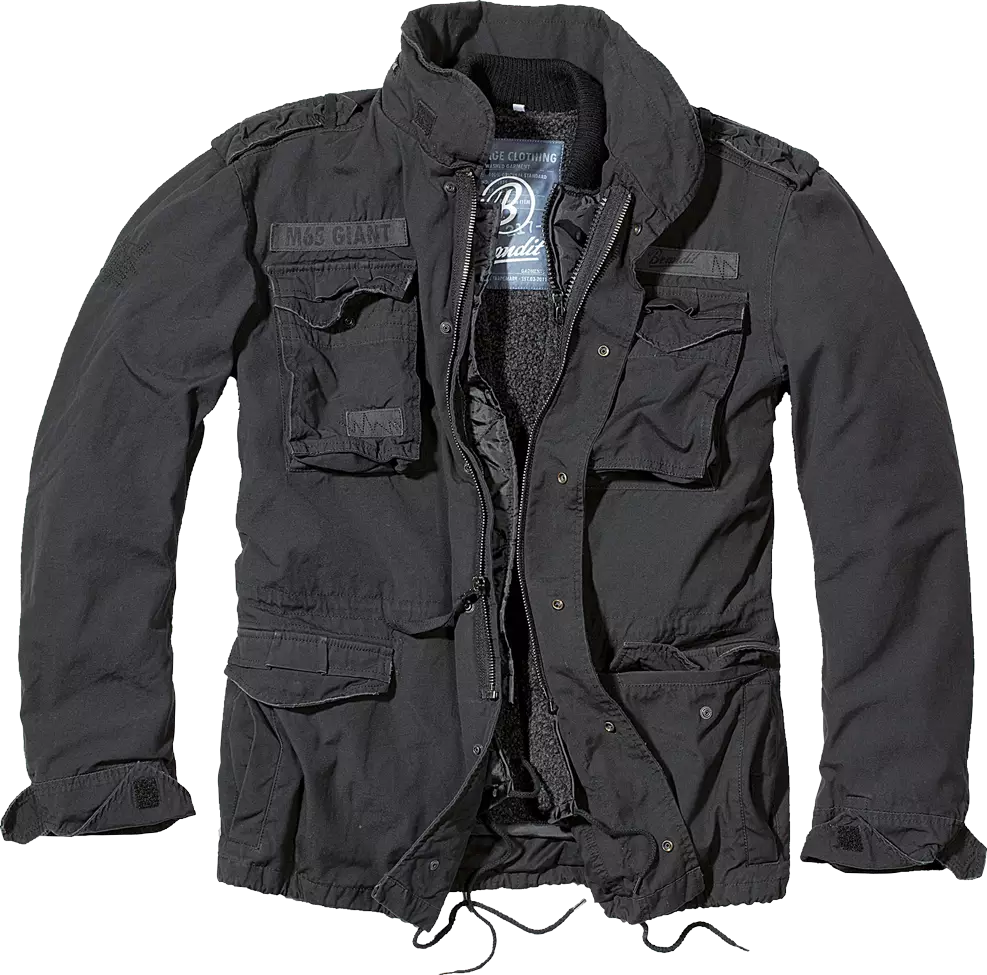 Brandit M65 Giant Military Jacket, Black. Inspired by the legendary M65 Rambot jacket, this is a super cool modern winter jacket. The jacket features a cotton exterior and is lined with an incredibly warm fleece teddy lining that attaches with zippers. It includes large snap-button secured chest pockets, upright front pockets, and side pockets beneath them. The waist and hem have drawstrings, and there’s a hood hidden inside the zippered collar. The thick, warm teddy lining is removable, allowing for seasonal versatility. When the lining is removed, the jacket may appear a bit loose, which is a tradeoff for this style; hence, it is primarily recommended for winter use. The sleeves are V-shaped with Velcro on the inside. Typically, these are turned inside, and they probably won't be turned down. The V-shape serves to keep the back of the hands warm. The chest features Brandit and M65 Giant logos.