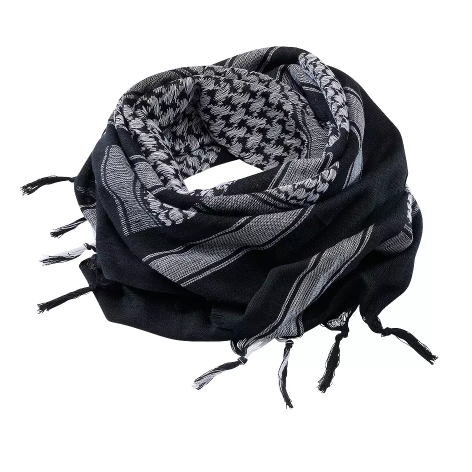 Brandit Shemagh Scarf, Black and White. The Brandit Shemagh scarf is a stylish and versatile accessory for outdoor activities, hiking, and everyday use. Inspired by the traditional Arab headdress, this Shemagh is designed to protect the user from the sun, wind, and dust. Made from high-quality cotton, this black and white scarf feels great against the skin and offers excellent breathability. It's also suitable for cooler conditions, as its thick and warm material helps retain heat.
