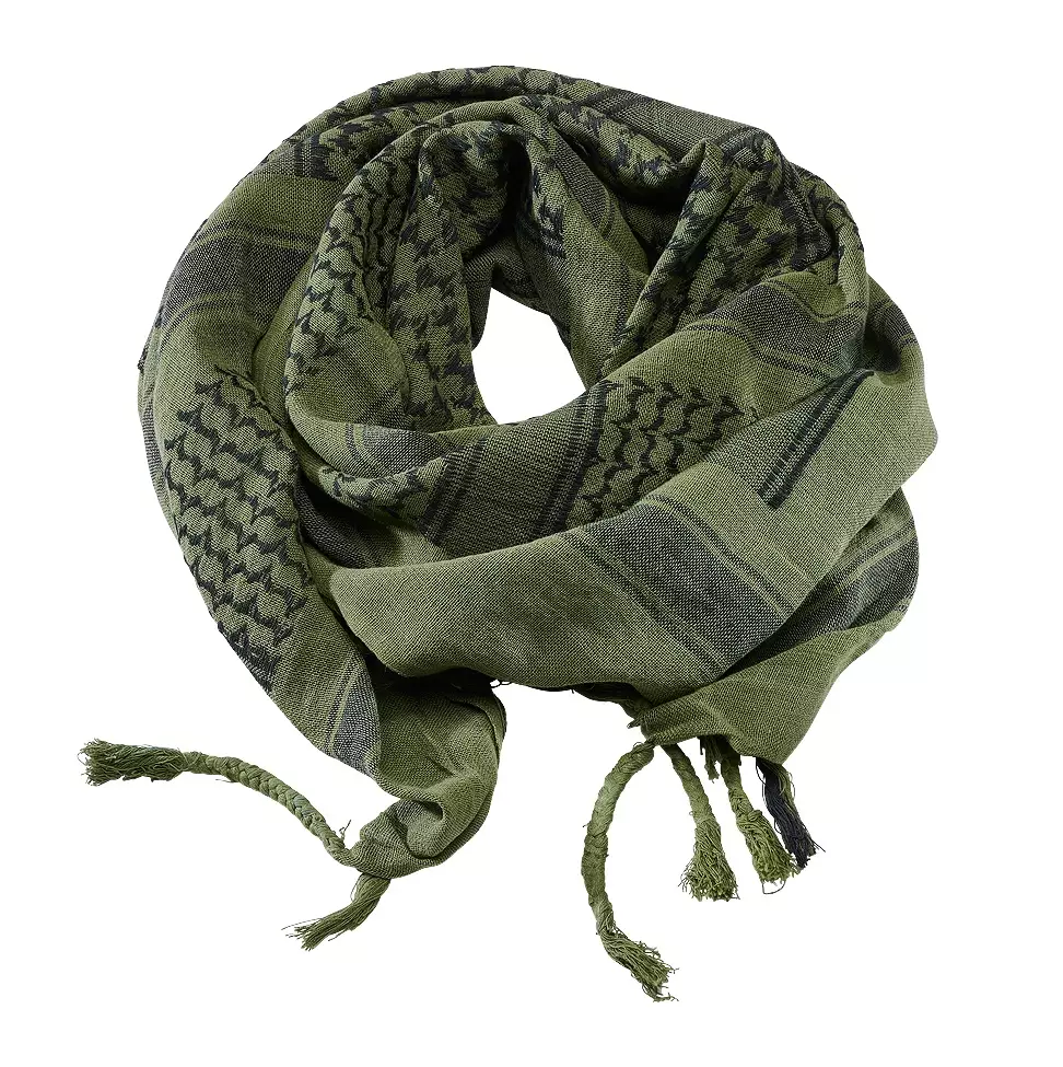Brandit Shemagh - Scarf, Olive Green/Black. The Brandit Shemagh scarf is a stylish and versatile accessory for outdoor activities, hiking, and everyday use. Inspired by the traditional Arab keffiyeh, the Shemagh is designed to shield its wearer from the sun, wind, and dust. This olive green and black scarf is made from high-quality cotton that feels comfortable against the skin and provides excellent breathability. It is particularly suitable for cool weather conditions, as its thick and warm material helps retain heat.