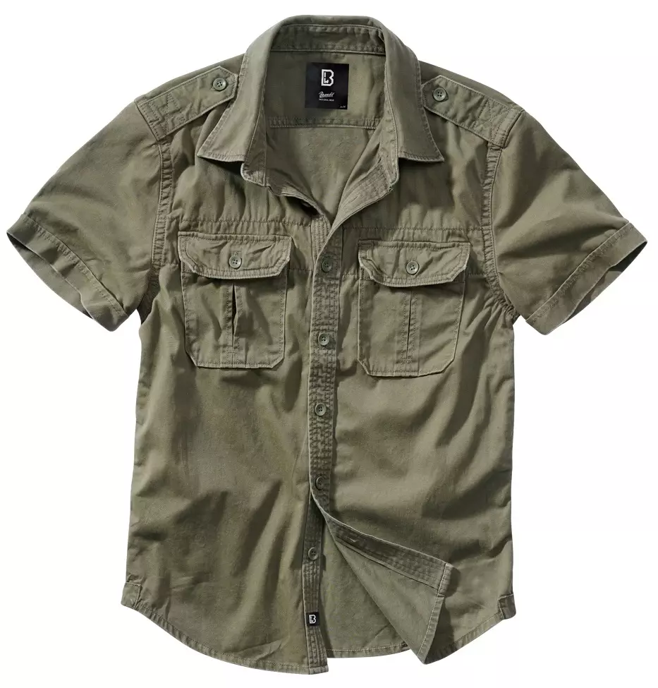 Brandit Short-Sleeve Button-Up Shirt, Green. The Brandit cargo-style short-sleeve button-up shirt is stylish and durable, making it perfect for urban exploration or summer festivals. This cotton shirt features button-down chest pockets and epaulette straps on the shoulders. It fastens with buttons at the front.