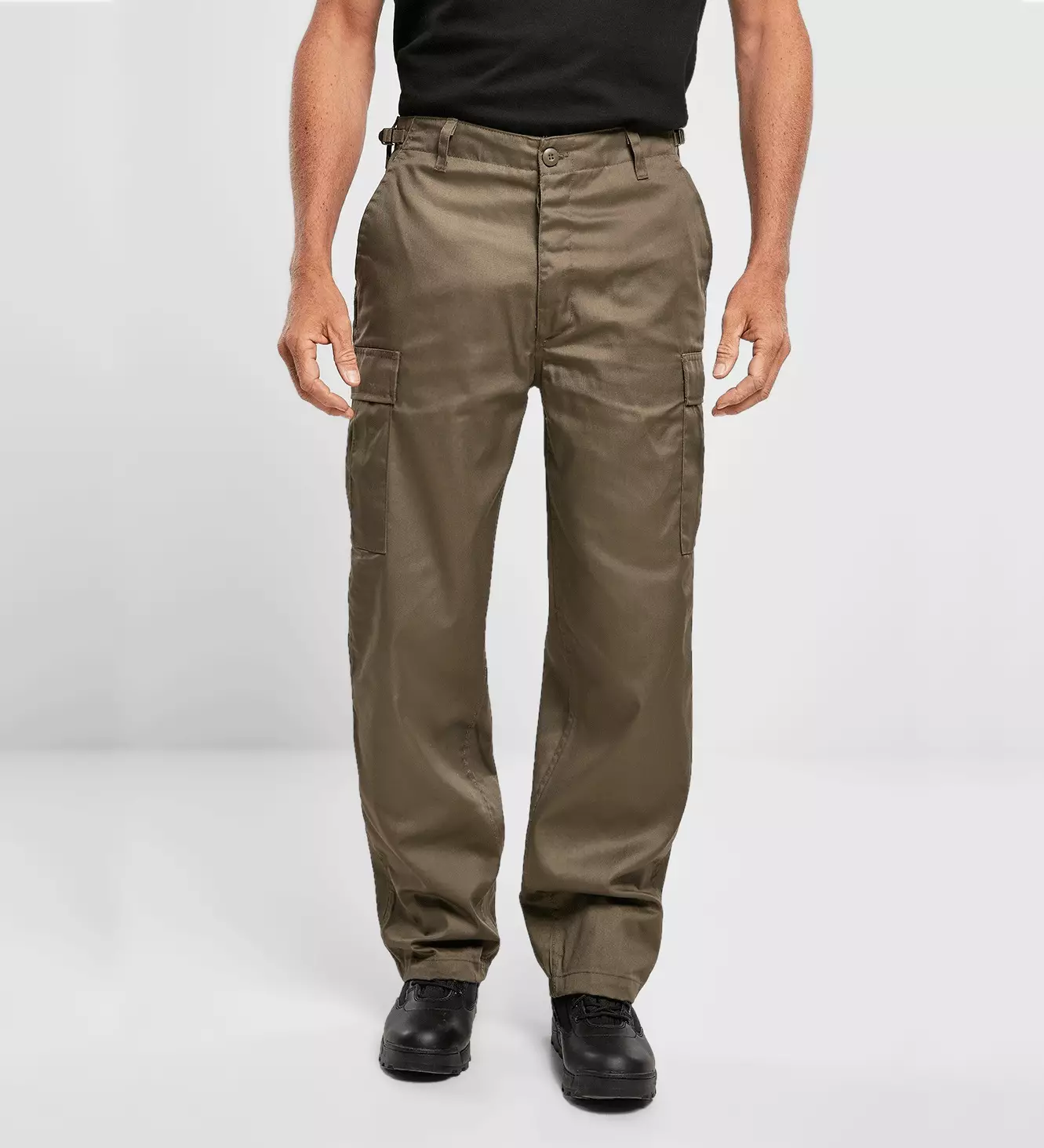 Brandit US Ranger Cargo Pants, Olive Green. Affordable polyester-cotton blend cargo pants in olive green with multiple pockets and buttoned fly. These robust pants feature side pockets, flap-button secured thigh pockets, and back pockets. The waistband includes 50mm wide belt loops, and the fly closes securely with buttons. The cuffs have adjustable drawstrings. Made from durable blended fabric to withstand tough conditions.