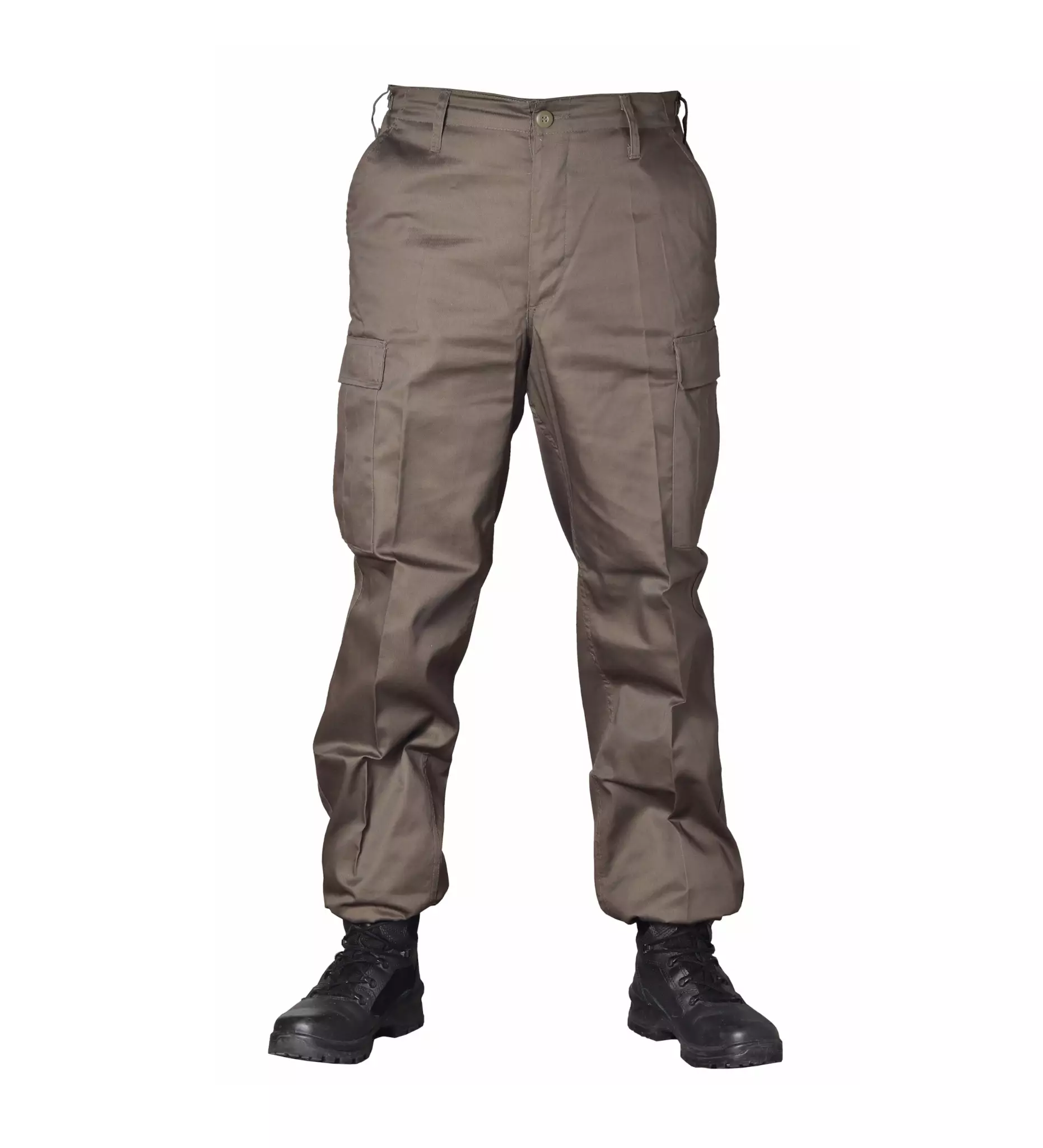 Brandit US Ranger Tactical Cargo Pants, Olive Green. Affordable yet rugged olive green cargo pants made from a durable blend fabric featuring multiple pockets and a button fly. These pants include side pockets, flap-closed cargo pockets, and back pockets. The waistband is equipped with 50 mm wide belt loops and an adjustable strap with a sliding buckle for a snug fit. The fly closes securely with buttons. The pant legs have adjustable drawcords to ensure a tailored fit.
