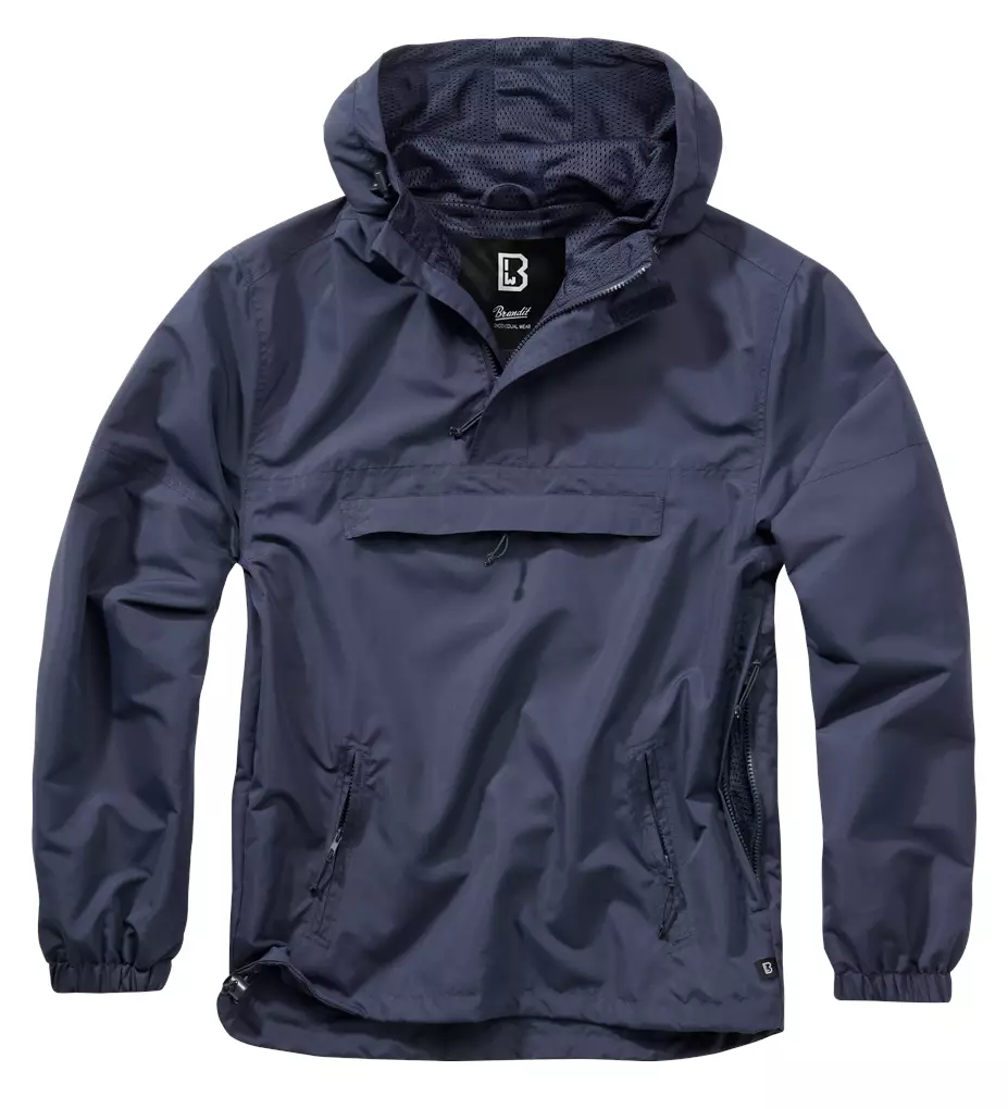Brandit Windbreaker Anorak Summer, Navy Blue. This wind-resistant and water-repellent anorak features a hood. Equipped with mesh lining, two zippered side pockets, and a large zippered front pocket for ample storage. The breathable mesh lining wicks moisture away from your skin and dries quickly, ensuring comfort during your outdoor adventures. The hood includes an adjustable drawstring for a snug fit.