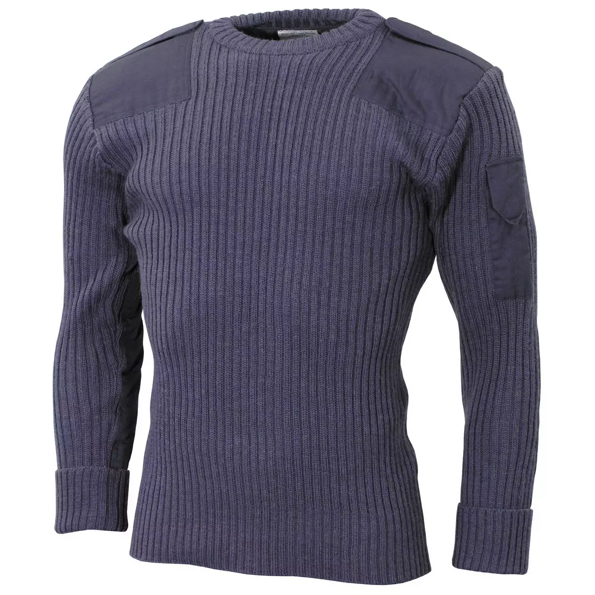 British Wool Sweater, Blue-Gray, Surplus. This crew-neck British wool sweater is incredibly warm and an economical choice for keeping your upper body warm. The sweaters feature epaulet placements on the shoulders, reinforced with polyester fabric at the shoulders and elbows. It closely resembles the Finnish military model. The design follows World War II styling, colloquially referred to as the commando sweater.