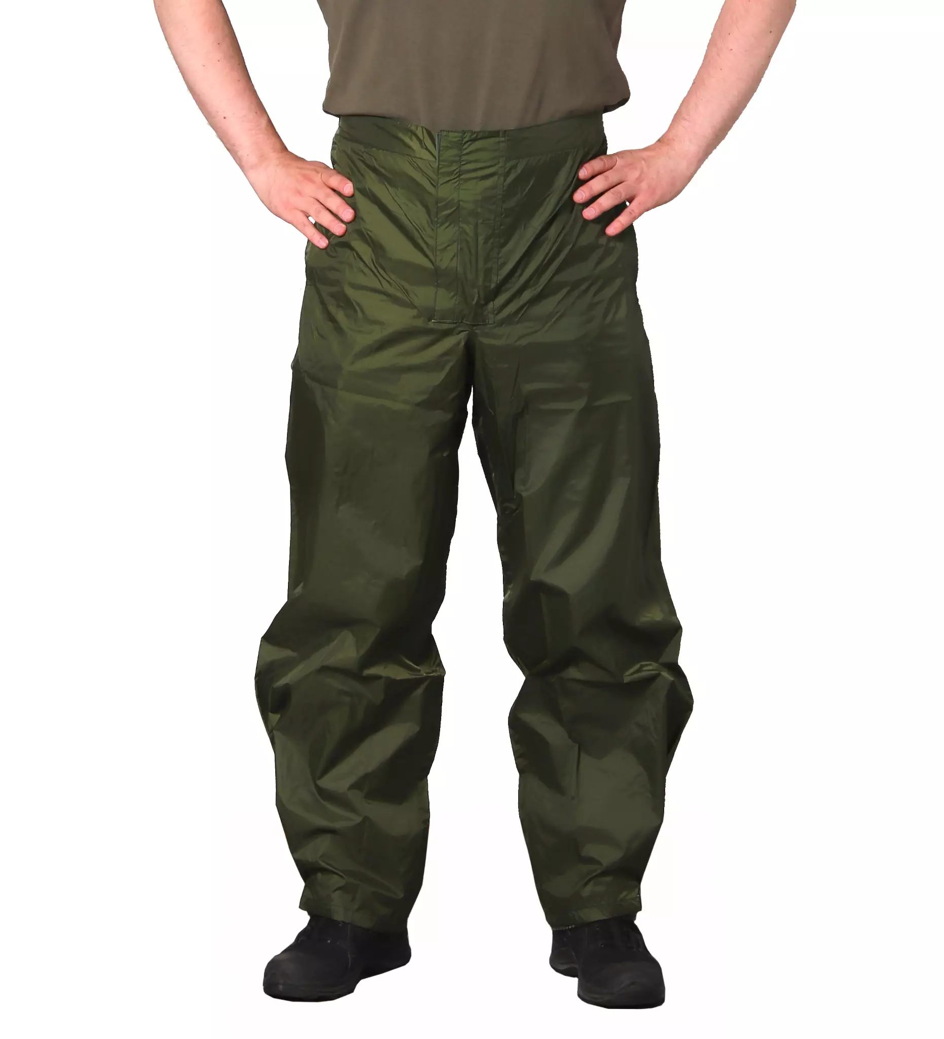 Danish Rain Gear Pants, Green, Surplus. Genuine, lightweight rain pants from the Danish army in a striking green color. These are the rain pants from the late 1980s, featuring taped seams for added durability. Given they have been in storage for decades, it's important to note that not all seams may be completely waterproof; hence the affordable pricing. Most of the pants feature Velcro strap adjustments at the ankles, and the waistband includes an elastic band that has shown some wear in certain items. Some pants still have either a button or Velcro adjustment for a more secure fit. These make excellent mud trousers for your outdoor adventures.