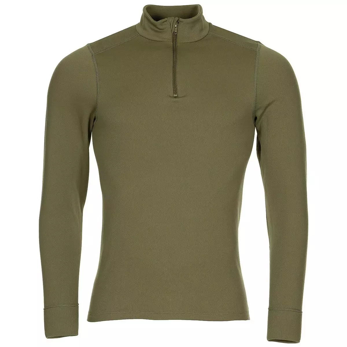 Dutch Long-Sleeve Shirt with Zippered Collar, Olive Green, Surplus. This long-sleeve pullover is crafted from durable Dutch technical polyester fabric in a rich green color. The seams are designed with a "flat" construction, ensuring comfort against the skin. Featuring a zippered front that runs from the chest to the collar, the zipper pull is cleverly concealed to prevent any irritation around the neck. The collar is slightly lower in height to provide a snug fit without being restrictive. Made from a thicker, stretchy technical polyester material, this shirt offers excellent softness and comfort, making it perfect as a base layer.