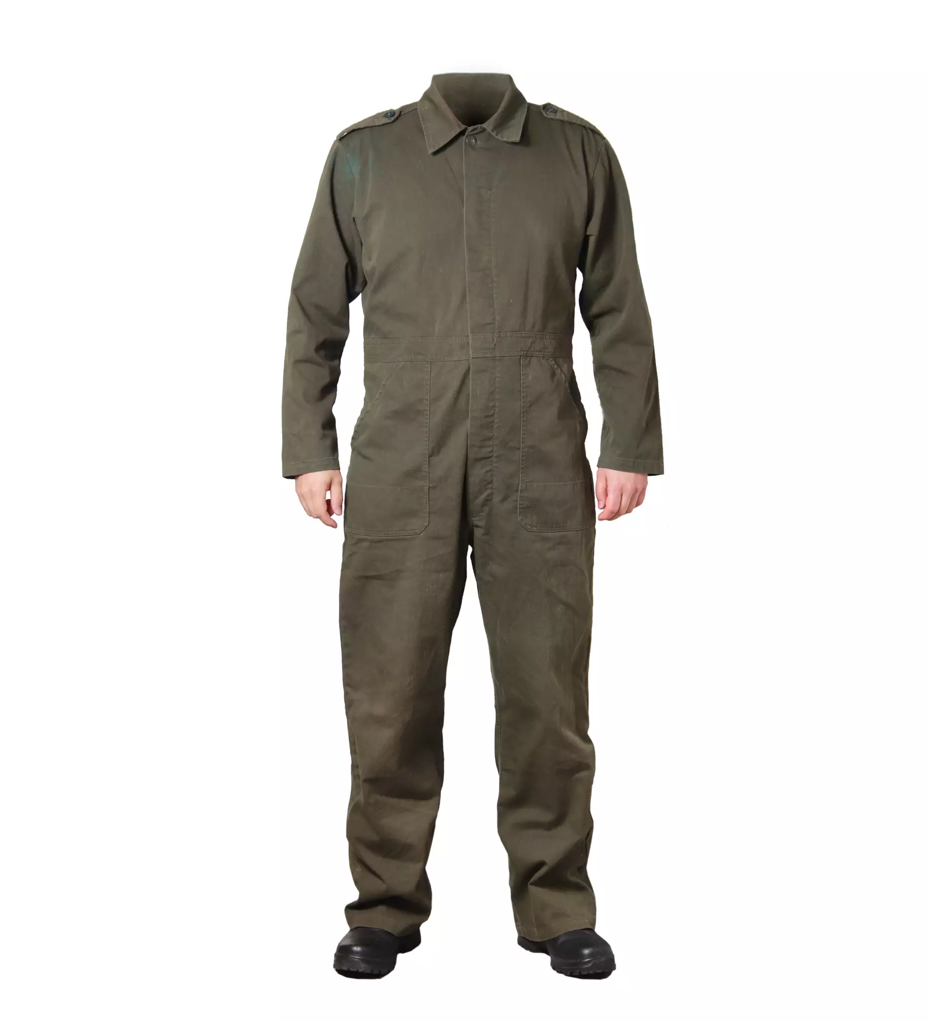 Dutch used blend fabric coverall. Ideal gear for renovation work, cottage wood gathering, or even moped repairs. The coveralls fasten with buttons and have two front pockets.