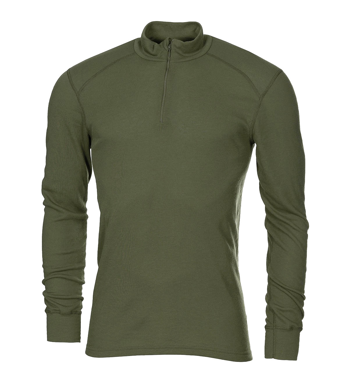 Dutch Odlo Long Sleeve Shirt with Collar Zipper, Olive Green, Surplus. A lightweight, slightly technical long-sleeve polo made by Odlo. Features flat seams for comfort. A zipper runs from the chest to the collar, with a hidden zipper pull to avoid irritation. The collar is slightly lower and does not constrict. The back is slightly longer to stay tucked in. The material is a stretchy, thin polyester.