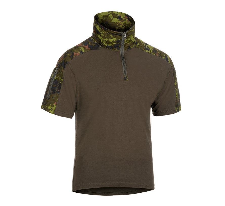 Invader Gear Combat Shirt Short-Sleeve Tactical Shirt, CAD. This technical field shirt is also known as the 'Combat Shirt' in English and is abbreviated as UBACS (Under Body Armour Combat Shirt), referred to in Finnish as 'tappelupaita'. The shirt is designed for active movement and combat, intended to be worn under vests, protection gear, etc. The torso of the shirt is made from a lightweight, highly breathable, and stretchy material. There are no pockets or additional features on the torso to avoid unnecessary bulk under vests, ensuring comfort for the warrior. The sleeves are made from durable ripstop fabric. The cut of the sleeves and collar resembles the ACU design: featuring arm pockets, Velcro cuff adjustments, and a high collar reminiscent of a mandarin collar to protect the neck and back.