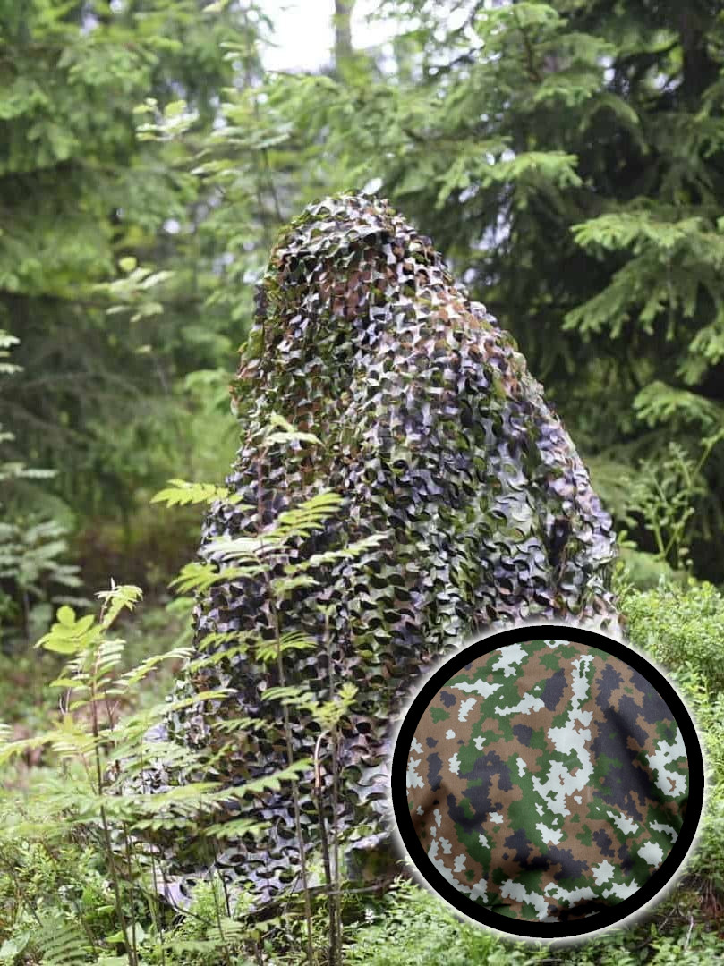 Camouflage Net M05 Frost Pattern, 150 x 200 cm. This camouflage net meets the military's IR reflection requirements and is printed on lightweight and durable ripstop fabric. It packs down to a very small size. With 2700 cutouts that break up outlines and blend the concealed object into the environment, it matches the colors of Finland's forest terrain regarding visible and invisible infrared light. It protects and conceals its user seamlessly.
