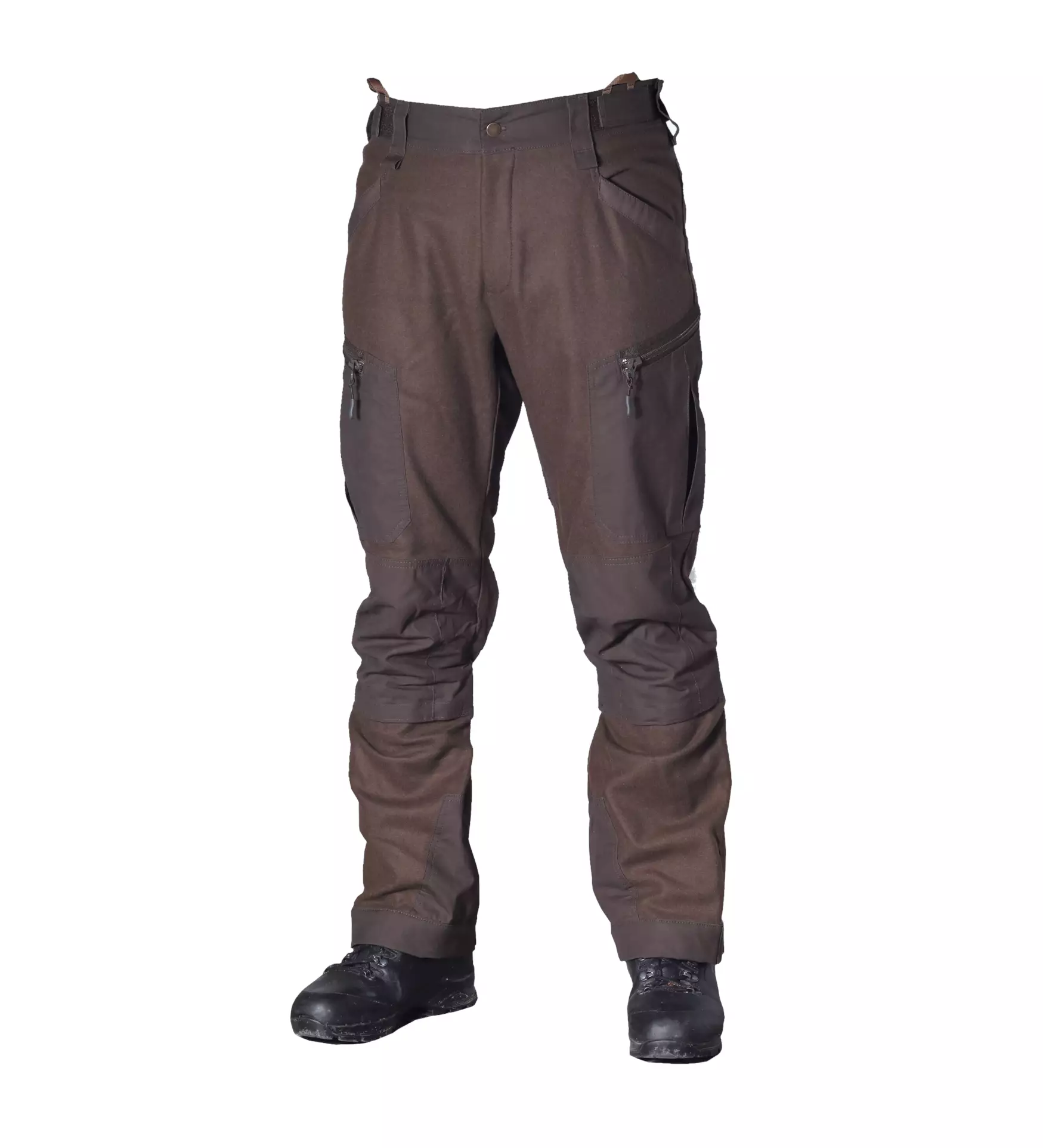 Rugged Wool-Cashmere Trousers, Brown. These durable wool trousers are breathable and ideal for nearly year-round use. The wool blend provides breathability, making them suitable for both the forest and the city. The rugged trousers feature a design familiar from combat pants. Comfort is enhanced by the stretchy fabric located below the waistband at the back, preventing any exposure of the lower back during movement. Zippered vents located at the back of the thighs help with airflow in hot weather and during vigorous activity. The sturdy wool fabric resists wear, and thanks to the cashmere wool, the trousers feel incredibly soft against the skin. Usually, rugged fabric can be a bit coarse which may lead to skin irritation without long underwear, but the wool-cashmere blend makes the fabric soft.
