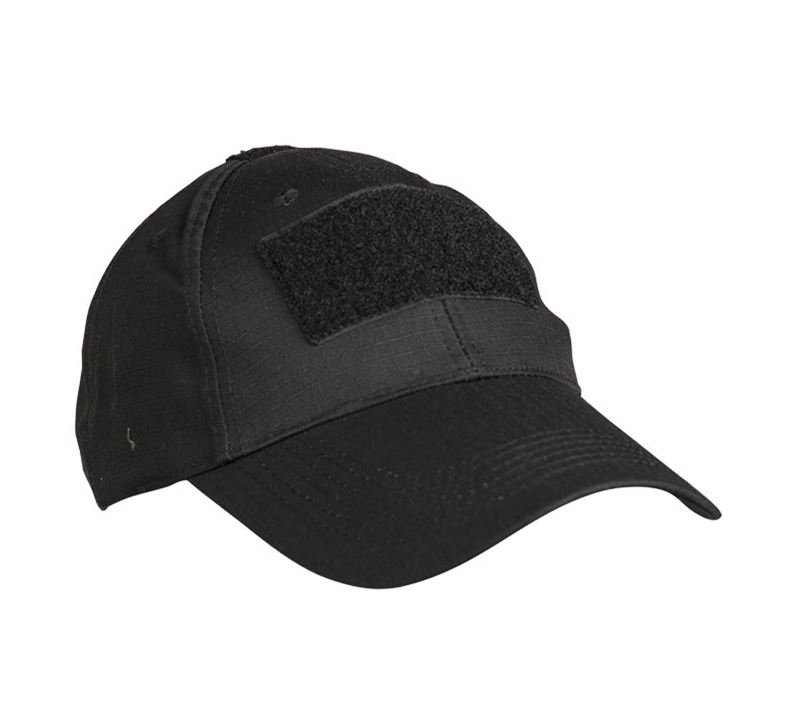 Tactical Baseball Cap, black, Mil-Tec. Adjustable tactical ripstop cap at the back, featuring Velcro patches on the front, back, and top. The cap also includes ventilation holes.