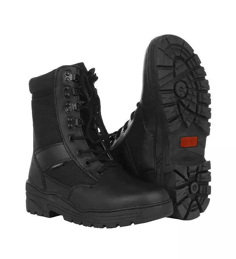 Tactical Boots, Black, Fostex. Rugged tactical boots made from premium cowhide leather with a durable polyurethane coating. The interior features a robust 900 denier polyester fabric and an insulating Thinsulate lining that retains warmth. The outsole is made of rubber, suitable for both rugged terrain and urban environments. Included is an impact-absorbing heel. Features a padded collar and a sturdy heel cup. Comes with a removable insole.