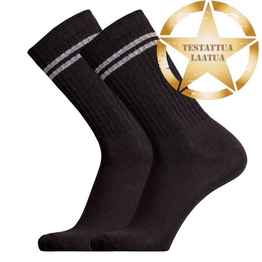 U.S.E. SA M05 Army Socks, Merino Wool, Black. Socks modeled after Finnish Army M05 socks, these black merino socks are perfect for everyday use or as secondary socks, particularly if you wear two pairs during marches. Merino wool provides excellent properties, such as warmth even when wet, and comfort on the foot. Synthetic fibers enhance the durability and elasticity of the sock. Merino wool socks are especially ideal with Gore-Tex and Sympatex footwear, ensuring your feet stay dry even if sweating. This product is proudly made in Finland and carries the Key Flag symbol!