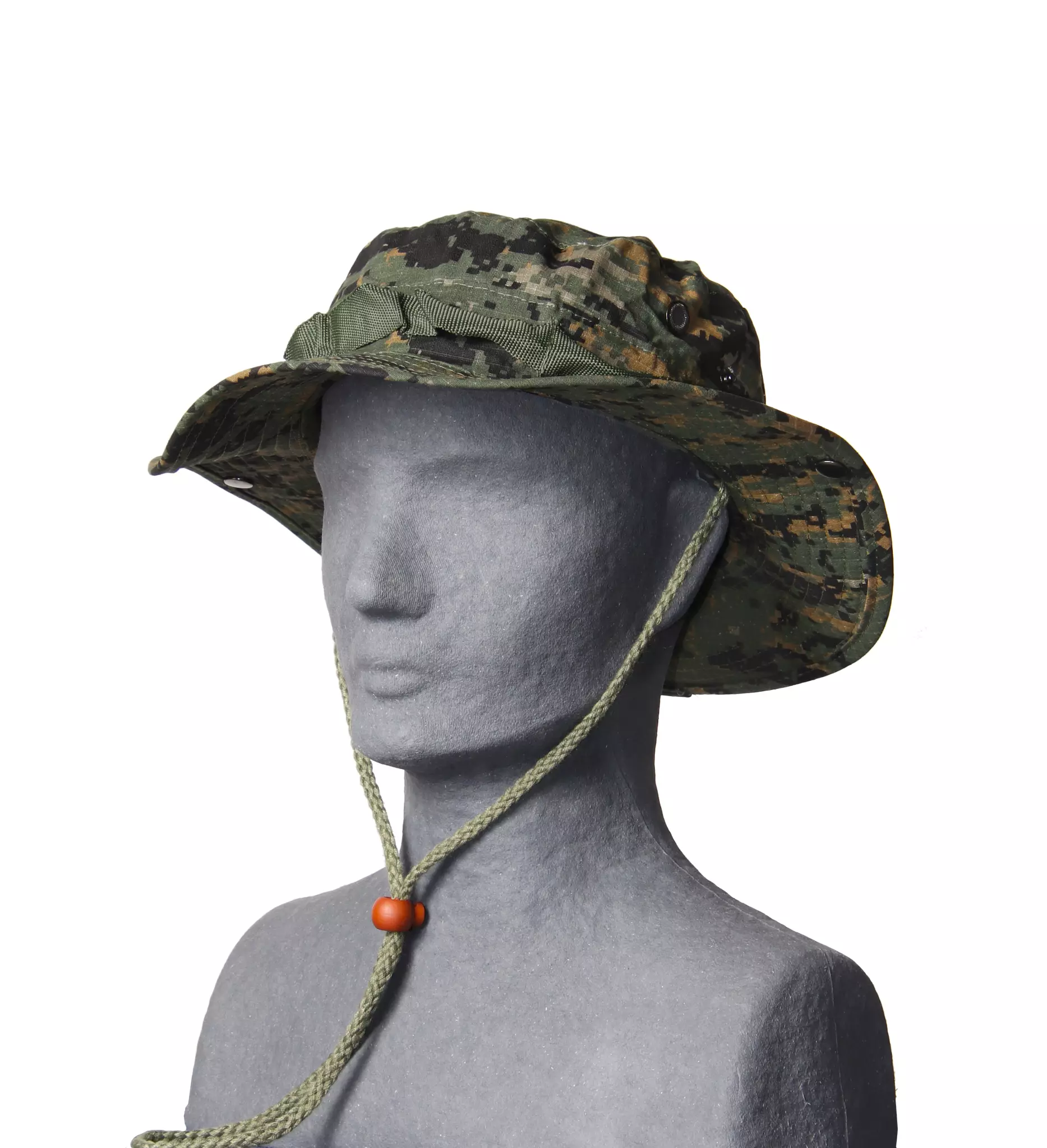 US Boonie Hat, Digital Woodland Ripstop. Durable ripstop fabric boonie hat featuring small round ventilation ports and a brim with a channel that allows for the attachment of various materials like branches. You can also hang your lures and flies in the channel, keeping them accessible during fishing trips. This boonie hat pairs perfectly with the original US mosquito net.