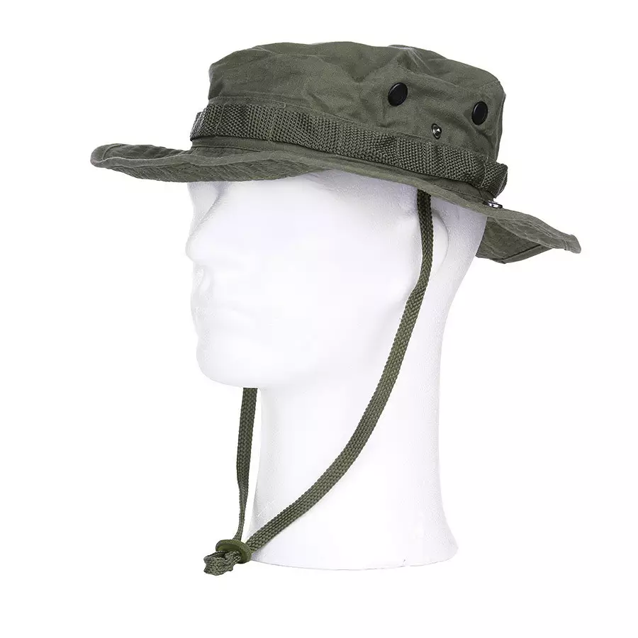 US Boonie Hat with Moldable Wire Brim, Ranger Green. This blended fabric boonie hat features small round ventilation vents and a channel at the brim's base to attach various materials like branches. You can also hang lures and flies in the channel, making them easily accessible for fishing. This hat pairs excellently with the original US mosquito net. The wire in the brim allows you to shape it to your preference.