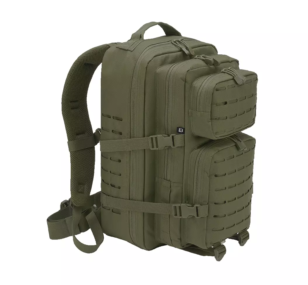 Brandit Assault Pack, Large, LaserCut, Olive Green. The Brandit Assault Pack LaserCut Large is a durable daypack designed for a variety of outdoor adventures. It features a spacious main compartment with two smaller pockets for organizing essentials, one of which is a mesh pocket. The back of the pack includes a large Velcro-sealed pocket ideal for a hydration bladder or a small laptop or tablet. Behind the main compartment is another sizable pocket equipped with additional smaller pockets. On the front, there are two smaller pockets sewn onto the surface. While the smaller pockets do not have inner compartments, the larger pocket offers space for documents and pens. Constructed from robust, thick nylon coated with PVC, this pack offers good water resistance, although it is not completely waterproof. All compartments close with zippers except for the hydration bladder pocket at the back. The pack provides ample attachment points along with laser-cut MOLLE webbing, allowing for customization with various gear and separate MOLLE pouches.