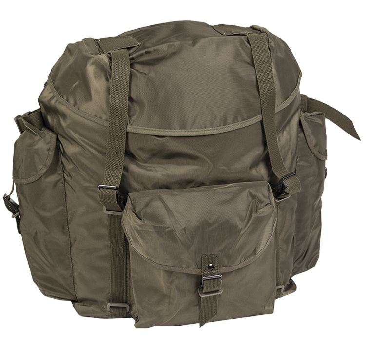 Austrian Army Combat Backpack, surplus. This large backpack features a spacious main compartment, side pockets, and a front pocket similar to the US Army's ALICE pack. It offers ample storage for your gear. The main compartment has a sizable pocket against the back, ideal for a sleeping pad for extra support or a hydration bladder. It closes with a drawstring and includes a storm flap, allowing for overpacking. A smaller external pocket for smaller items is located on the front, and there are milk carton-sized side pockets. Above these pockets, there are tightening straps to secure tools such as an axe. The padded H-style shoulder straps are detachable. This backpack and harness are part of the combat system, providing extra attachment points on the straps. All buckles are metal. The bottom of the backpack is rubberized. If you need a simple, large backpack, this is the right choice for you. Separate packing bags can be used to keep your gear organized.