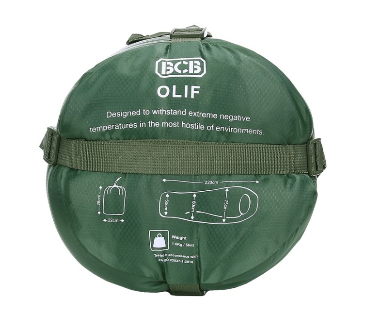 BCB Olif 5 Sleeping Bag, Olive Green. The Olif 5 is a mummy-shaped fiber sleeping bag designed for cool weather (spring, summer, autumn). The shell fabric is moisture-repellent ripstop nylon. It features a two-way zipper on the side, secured with a velcro flap. The sleeping bag is partitioned and tapers at the foot end. Approximately 75 cm wide at the shoulders and 50 cm at the foot end. Includes external hanging loops at the foot end.