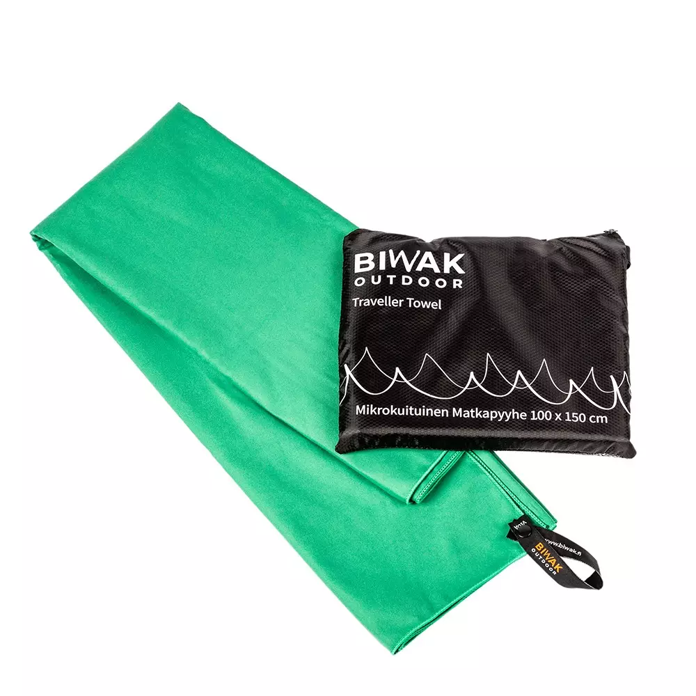 Biwak Travel Towel 100x150 cm, green. This travel towel is crafted from high-quality microfiber, featuring an impressive 30,000 fibers per square centimeter. Its absorbency outperforms cotton by five times. Considering its weight, this microfiber towel holds seven times its weight in water. It dries your skin even when it’s soaking wet!