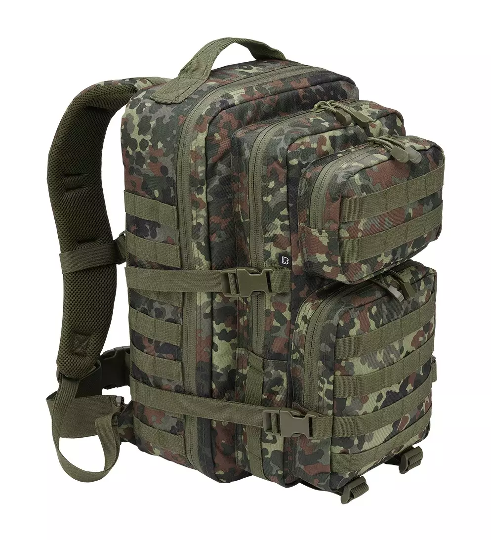 Brandit Assault Pack, Large, Flecktarn. The Brandit Assault Pack tactical backpack is perfect for everyday use and hiking. This backpack features one large main compartment, with two smaller pockets inside for various essentials. On the back, there is a spacious Velcro pocket designed for a hydration bladder or even a small laptop or tablet. Behind the main compartment is another sizable pocket, which also houses smaller pockets inside. Additionally, the front features two stitched smaller pockets. The smaller pocket has no internal pockets, but the larger one includes a sleeve for a notebook and pens. The backpack is made from durable thick nylon that is PVC-coated, offering good moisture resistance. However, it is not entirely waterproof. All compartments close with zippers, except for the hydration pocket at the back. The pack comes with ample adjustments and Molle webbing for attaching various gear and separate Molle pouches.