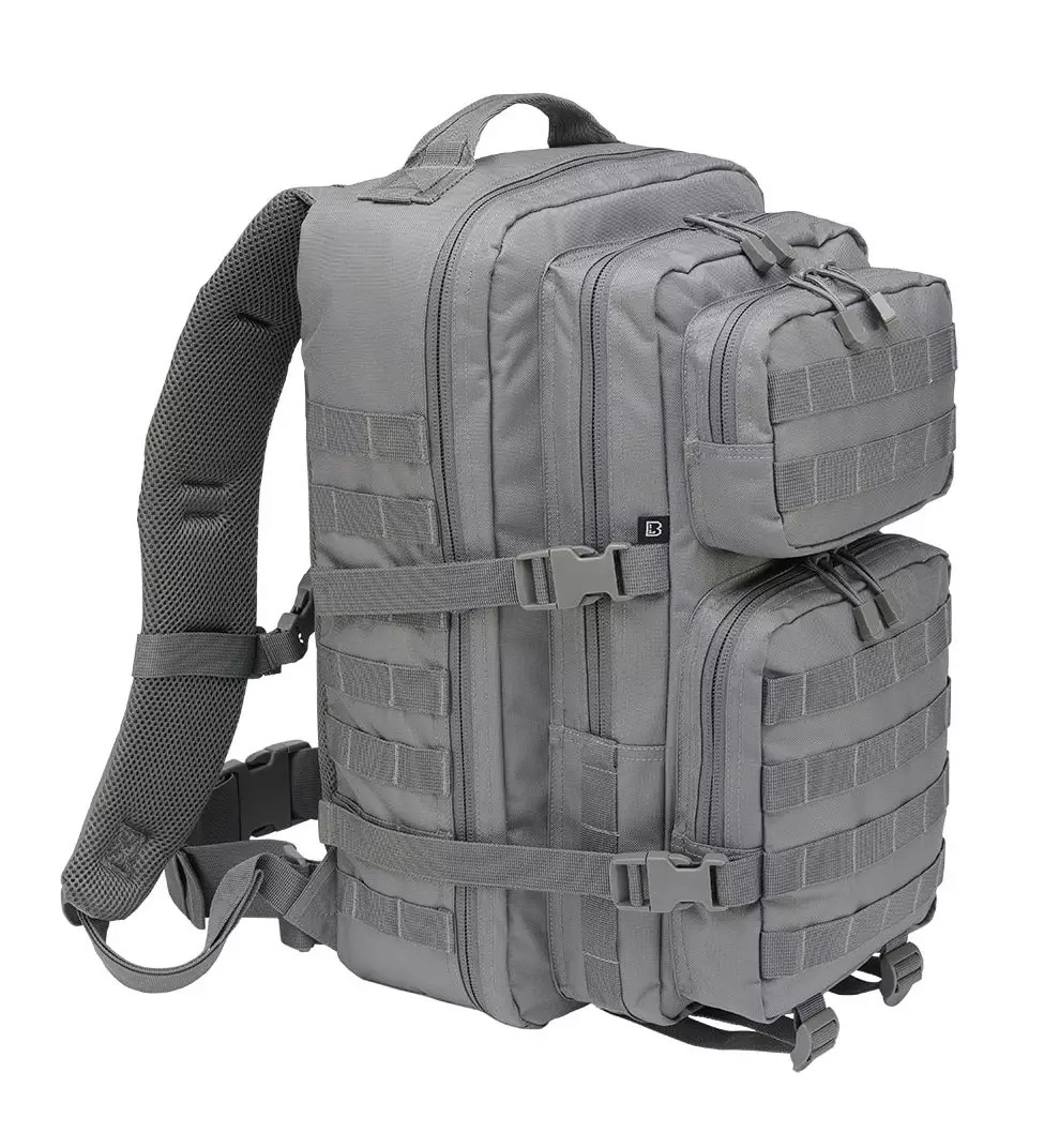 Brandit Assault Pack, Large, Gray. The Brandit Assault Pack tactical backpack is perfect for everyday use and hiking. It features one large main compartment with two smaller pockets for all your essentials. The back of the pack includes a large Velcro pocket suitable for a hydration bladder or even a small laptop or tablet. Behind the main compartment is another sizable pocket, including smaller pockets inside. Additionally, it has two smaller pockets sewn onto the front; the smaller one does not have internal pockets, while the larger contains a space for a notepad and pens. The pack is constructed from durable heavy-duty nylon coated with PVC, offering excellent water resistance but is not completely waterproof. All compartments close with zippers, except for the hydration bladder pocket on the back. The pack has ample adjustment options and MOLLE webbing systems to attach various gear and separate MOLLE pouches.