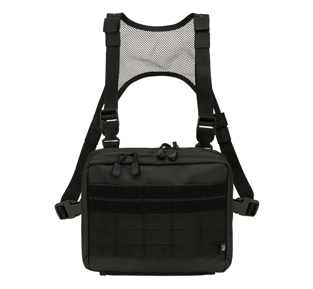 Brandit Chest Bag, Black. The Brandit Chest Bag allows you to organize all your small gear, such as a compass, map, multitool, or anything else you might need. The bag opens to a 90-degree angle, enabling hands-free map reading. This bag features removable straps and can be attached to your backpack’s shoulder straps with a simple DIY fix if needed. Inside, there are various small pockets and attachment points for all your bits and pieces. It includes two separate zippered compartments, one with multiple MOLLE elastic loops and a removable map pocket, while the other features mesh pockets, a zippered pocket, and a row of elastic loops. The front of the bag has five rows of 5x5 MOLLE webbing, with Velcro on the top two rows. A small mesh pocket on the bottom exterior is perfect for storing a first aid strap.