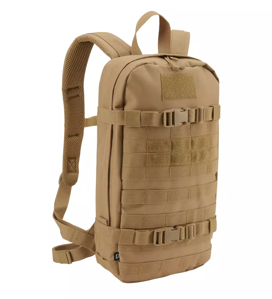 Brandit Cooper Daypack 11 L - Khaki. The Brandit 11-liter lightweight versatile daypack features padded shoulder straps. It serves ideally for multiple activities or as a work pack where you can easily store snacks. Its standout feature is its slim and light design, making it easy to fit through tight spaces on your back. The pack includes one large main compartment, equipped with a mesh pocket and a zippered pocket. The front of the backpack features compression straps which are perfect for securing rain gear or a camera tripod. The shoulder straps come with an adjustable sternum strap, allowing you to customize the fit to your liking.