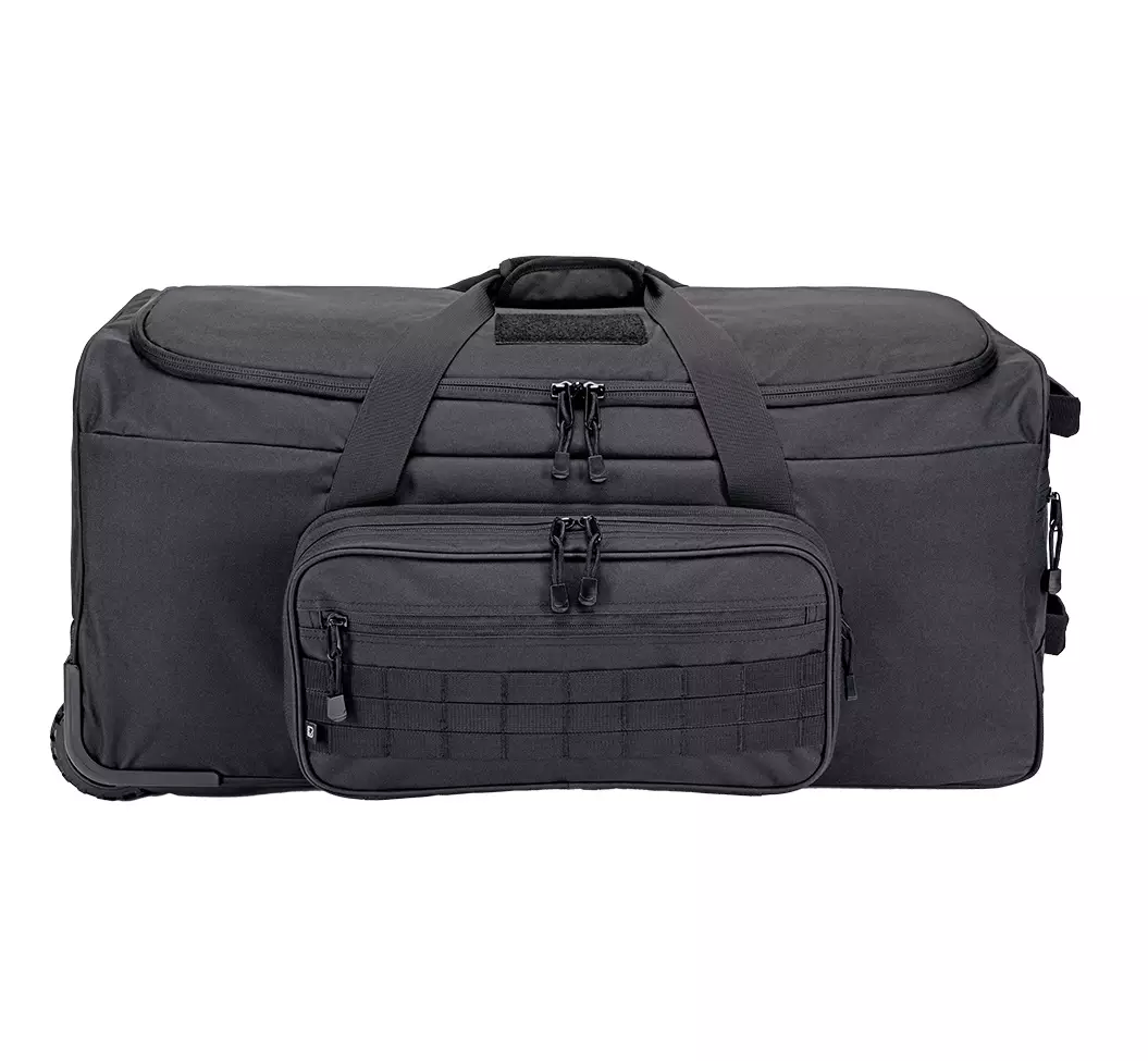 This bag features a convenient wheeled design (3 wheels), making transport effortless without the need to carry it. At one end, there is an ergonomic pull handle that enhances lugging ease while maneuvering on wheels. The bag includes a large main compartment, as well as separate internal and external pockets to keep your equipment organized. Inside, it is equipped with a MOLLE/PALS webbing system that lets you attach additional pouches.