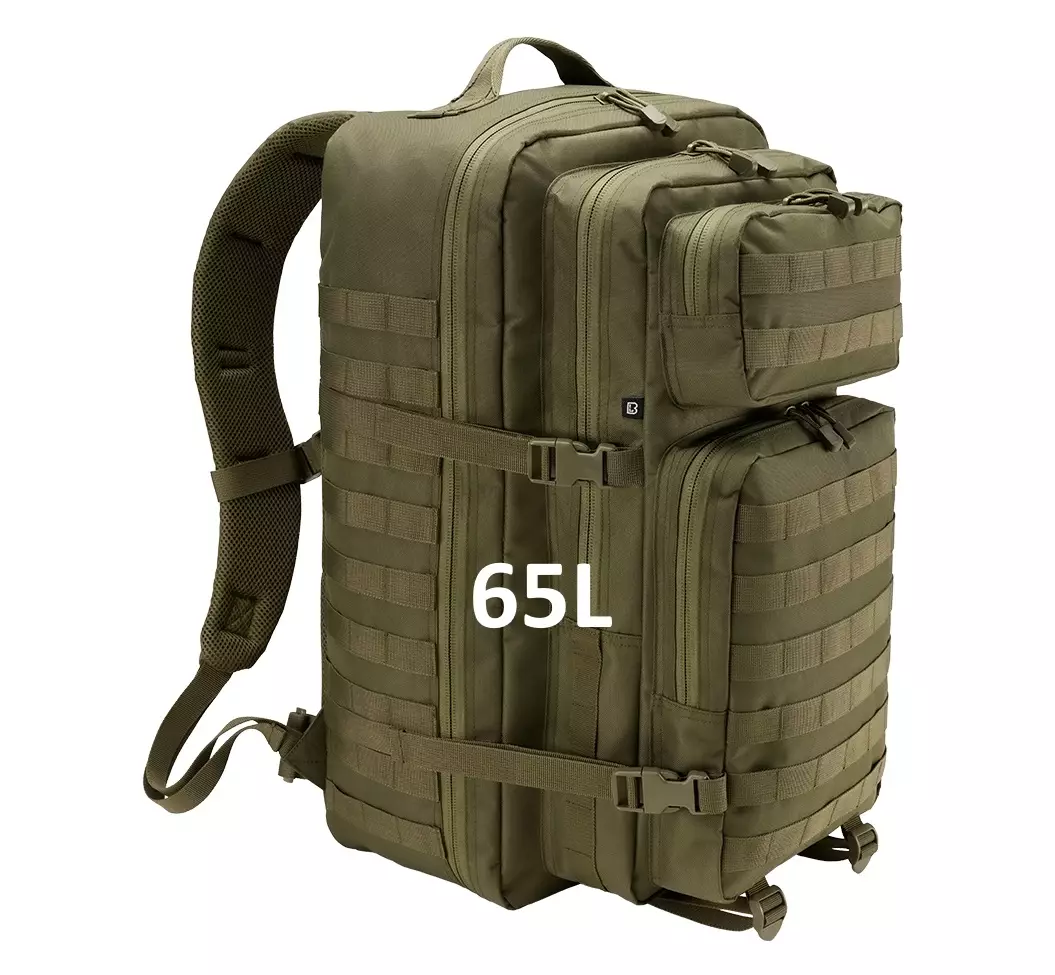 Brandit Cooper Pack, XL, Olive Green. The Brandit Assault Pack XL is truly a large backpack designed for everyday use. This rugged pack features one spacious main compartment, which includes two smaller pockets for organizing your gear. On the back side of the backpack, there is a large Velcro flap compartment, perfectly suited for a hydration bladder or a small laptop or tablet. Behind the main compartment, you'll find another sizable pocket that also contains smaller pockets inside. Additionally, there are two surface-mounted smaller pockets on the front. The smaller pockets do not have inner compartments, but the larger one includes a slot for documents and pens. This backpack is crafted from durable heavy-duty nylon, coated with PVC for excellent resistance to moisture. However, it is not fully waterproof. All compartments close with zippers, except for the hydration pocket at the back of the pack. The bag offers ample adjustment options and MOLLE webbing for attaching various gear and additional MOLLE pouches.