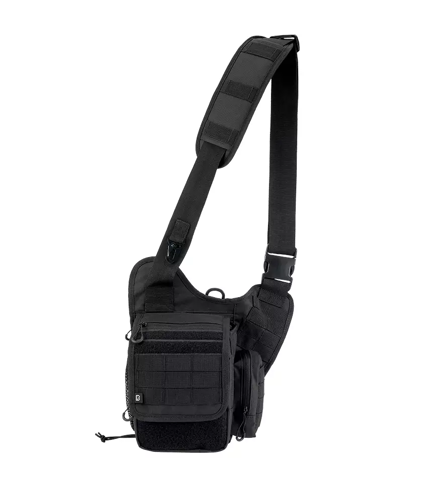Brandit Travel Side Bag, black. This travel side bag is equipped with a single shoulder strap for easy carrying at your side. It features a variety of compartments to keep your essential items organized. Ideal for carrying your wallet, phone, rain jacket, and other small gear. The bag includes one large main compartment with a drawstring closure. Over the main compartment is a flap secured with Velcro. Inside, you’ll find a zippered pocket, along with a little Molle/PALS webbing and a Velcro patch area for attaching patches. One side has a zippered pocket while the other side features a mesh pocket. On the back, there's a snap-button secured pocket. The shoulder strap is adjustable, and there is a metal clip in front to hang a water bottle. Additionally, there is a small zippered pocket above the front flap.