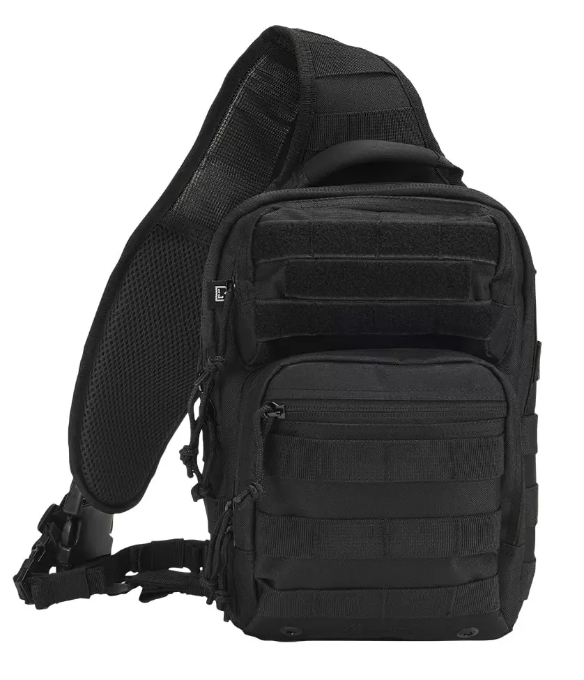 Brandit Sling Bag, Black. Brandit's compact one-strap sling bag is ideal for short trips. It accommodates snacks and a rain jacket, along with any additional gear you might need. The bag features one main compartment that secures with a zipper. On top of the main compartment, there are two zippered pockets, with the upper pocket being smaller. The upper pocket includes a Velcro patch for attaching your morale patches. The lower pocket includes MOLLE/PALS webbing for additional attachments. Also, there's a small zippered pocket for your passport or other essentials. The bag has a top carry handle for easy transport. The shoulder strap is adjustable, and it includes a safety strap to prevent accidental slippage. The strap also features MOLLE webbing for further attachments. On the back of the bag, there’s a snap-button closure open pocket, covered with mesh fabric for enhanced breathability.
