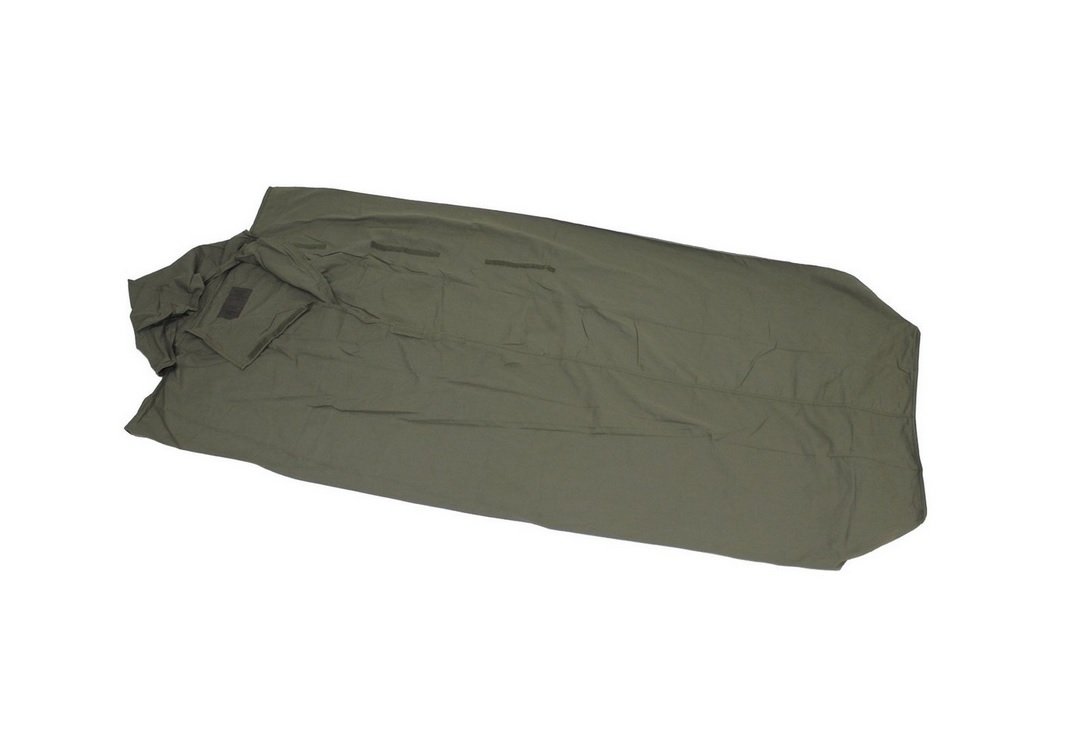 British Arctic Sleeping Bag Liner, Surplus. The material of the liner is a thin, dense cotton, and the protective bag features a half-length, Velcro-sealed opening allowing easy entry into the bag, along with an integrated hood. The width of the bag is approximately 86 cm, and the length with the hood is approximately 195-205 cm (all slightly different lengths). The bag tapers down to the foot end, with dimensions of about 50 x 30 cm at the bottom, providing ample space for your feet. Ideal as a sleeping bag 'sheet' or on its own during warm summer conditions.