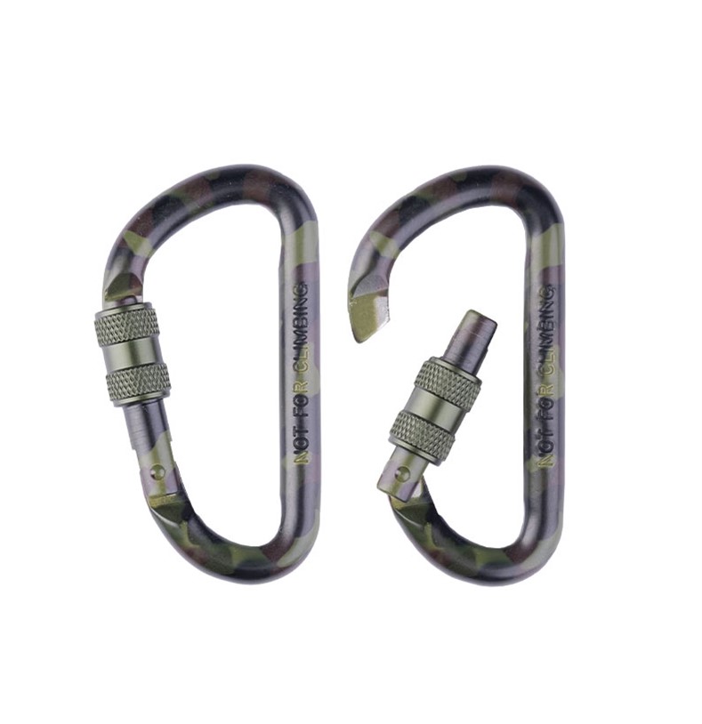 Carabiner 80 mm 2 pcs, woodland, Mil-Tec. With this slightly larger carabiner, you can securely attach your gear to your backpack or elsewhere. The carabiner features a screw lock, ensuring that items don't come loose easily.