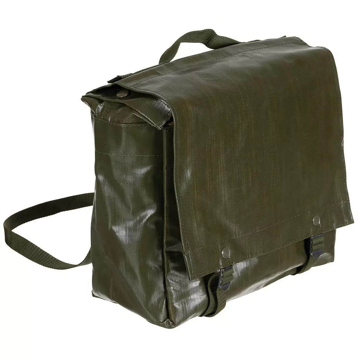 Czech M85 Vinyl Bag, surplus. A vintage Czech/Slovak bread bag featuring a shoulder strap. Made from durable, poison green vinyl, this moisture-resistant bread bag is as functional as it is rugged. It may have a rough look, but this bag is perfect for your outdoor adventures… even crows won’t mock you while you carry this through the wilderness.