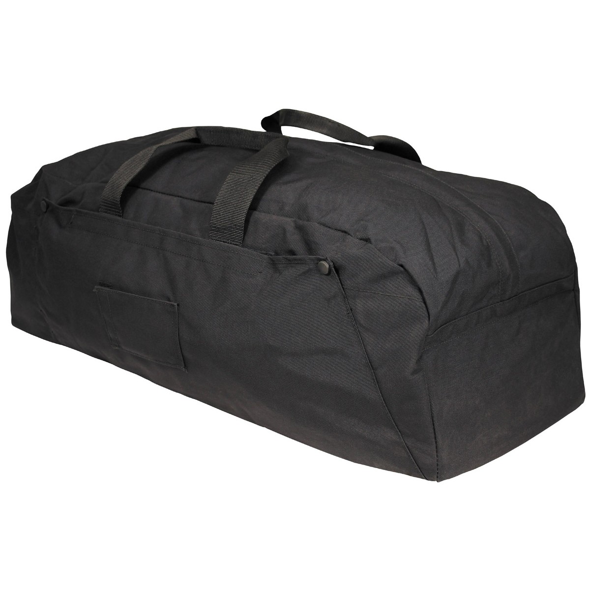 Dutch Deployment Bag 75 L, Black, Surplus. Can be used as a backpack or a duffel. Two straps for carrying as a bag and padded shoulder straps for backpack carry. Features two large Velcro-secured side pockets. It's not completely waterproof, but the strong Cordura fabric is dense and keeps light moisture out. The fabric is sturdy Cordura material. The bag closes with a robust two-way zipper. Inside there is one long zippered pocket and another pocket with Velcro flap closure.
