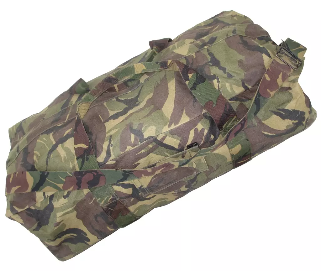 Dutch Gear Bag 70L, DPM, Surplus. A robust large combat carry bag from the Dutch army in DPM (Disruptive Pattern Material) color, equipped with a two-way zipper, carrying strap, and shoulder strap, designed with a waterproof interior. This bag is brilliantly suited for your gear and perfect for rugged use without worry of dirt. Note: this model does not feature backpack straps, so it is intended for shoulder carrying or hand-held transport, which is reflected in the price.