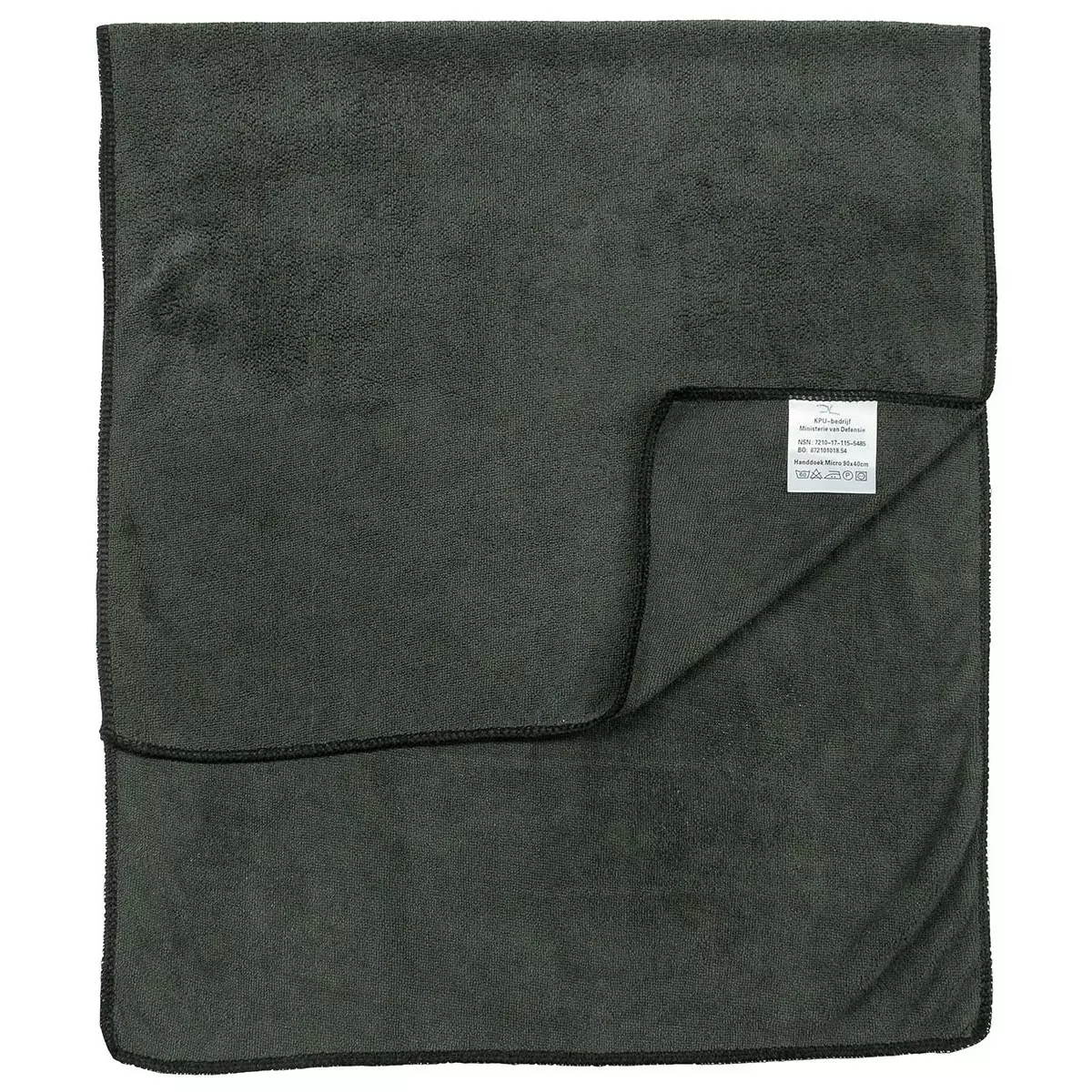 A lightly used or unused Dutch Army microfiber towel in grey-green. Microfiber is a synthetic fabric known for its breathability and water vapor permeability.
