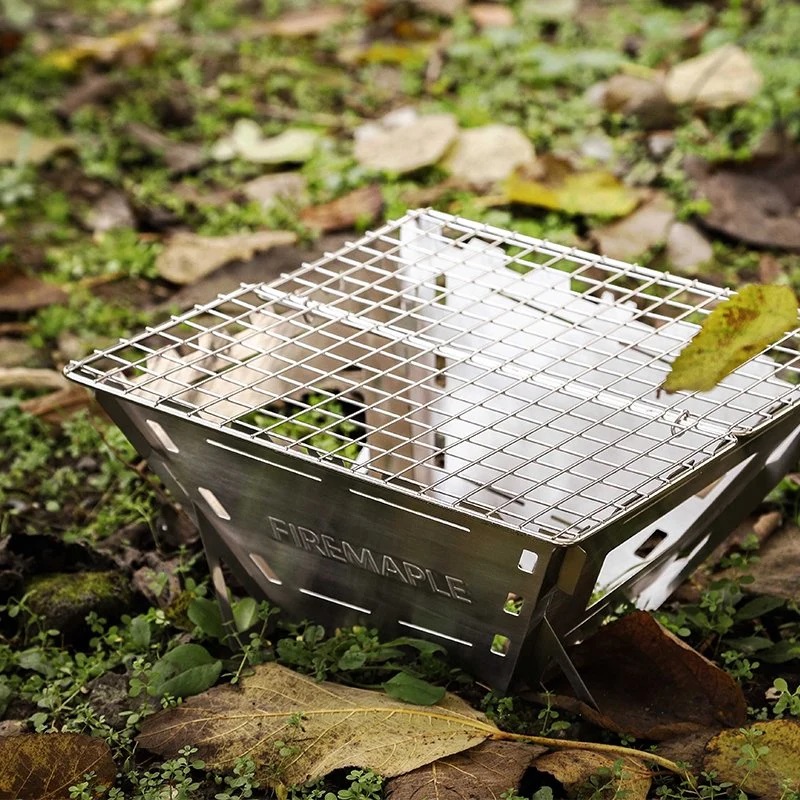 Fire-Maple Maverick 4 Camp Grill, Stainless Steel. The Maverick is a square, foldable, large, and lightweight camp grill. It is easy to assemble, snap, and the pieces fall into place easily. The assembled grill features a stainless steel cooking grate that can be folded in half, allowing for easier addition of larger wood pieces. Note that this is treated as an open flame, safety precautions should be considered. It is recommended to use sand, gravel, rock, or something else that doesn’t easily catch fire as a base.