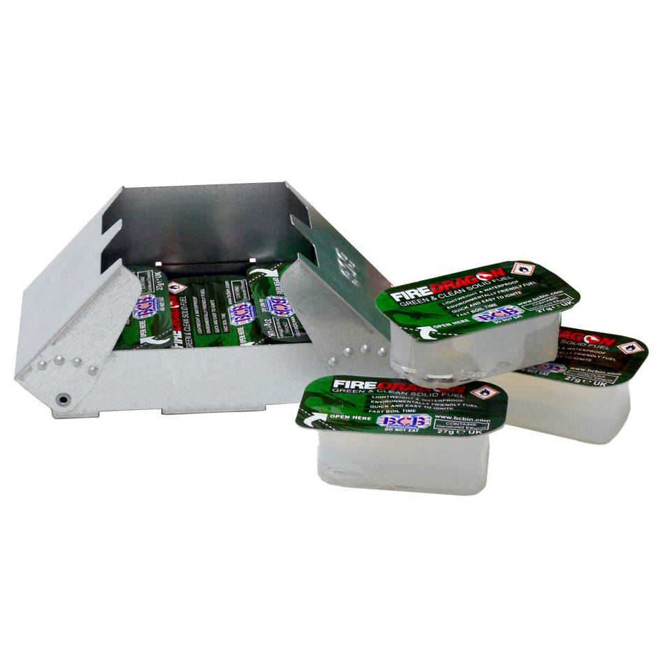 FireDragon I Tablet/Stick Stove. Extremely compact and lightweight ESBIT-style folding stove made from aluminum, allowing you to use solid fuel tablets, twigs, or similar fuels.