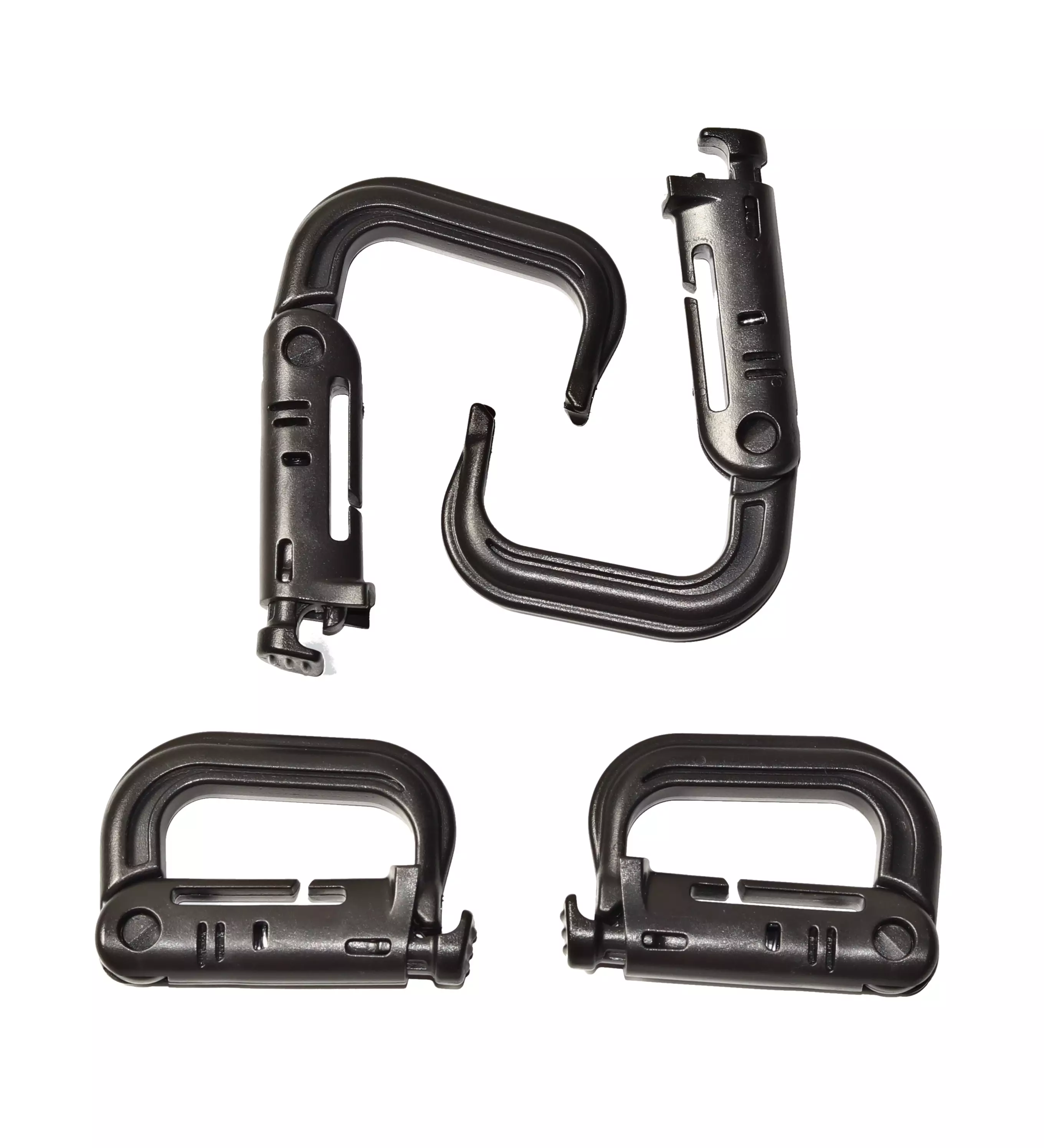 Grimloc Carabiner Set of 4, Black. This plastic Grimloc carabiner allows you to securely attach or hang your gear. It easily threads onto any MOLLE webbing system. This carabiner is not intended for climbing or hanging loads but is designed for lightweight tasks, such as hanging a water bottle or gloves.