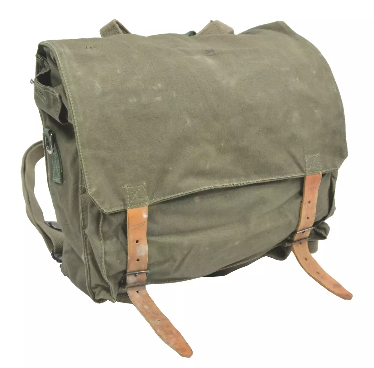 JNA Combat Backpack, Surplus. A backpack from the days of the Yugoslav People's Army, later inherited by the Serbian Army. A handy small backpack made of cotton fabric, featuring adjustable shoulder straps. The shoulder straps are detachable and come with small padding. It can also be hung from a belt for use as a butt bag or shoulder bag. The backpack has straps for securing a rolled-up blanket, poncho, or other items. There is a small snap-button pocket under the flap that closes with leather straps. Note the size!