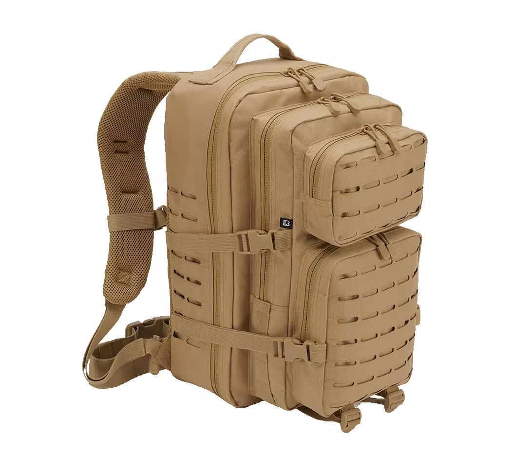 Brandit Assault Pack, Large, LaserCut, khaki. The Brandit Assault Pack LaserCut Large is a rugged daypack built for any outdoor endeavor. It features a main compartment with one large pocket and two smaller internal pockets for organizing your essentials, including a mesh pocket for easy visibility. The back of the pack includes a spacious Velcro-closure compartment, perfect for a hydration reservoir or even a small laptop or tablet. Behind the main pocket, there's an additional large pocket, which also contains smaller pockets for further organization. On the front, two smaller externally attached pockets offer convenient access, with the larger pocket including compartments for documents and pens. Made from durable, thick nylon that is PVC-coated, this pack withstands moisture effectively, though it is not completely waterproof. All compartments zip securely, except for the hydration pocket located at the back of the pack. The pack provides ample room for gear and features laser-cut MOLLE webbing, allowing you to attach a variety of items and additional MOLLE pouches.
