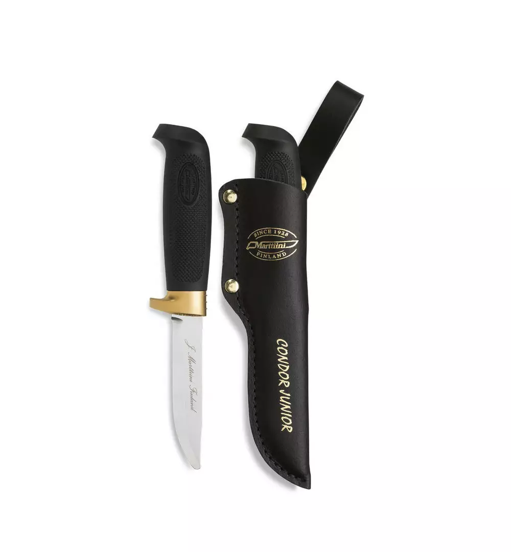 Marttiini Condor Junior is the first knife for young users. Safe, rounded tip protects little carvers from puncture wounds and cuts. The blade material is easy-to-care stainless chrome steel. The blade's bevel and sharpening angle are the same as those of a larger carving knife. The textured rubber handle and finger guard ensure a firm grip. The handle is also the right size for a child's hand. Naturally, a proper knife comes with a real leather sheath.