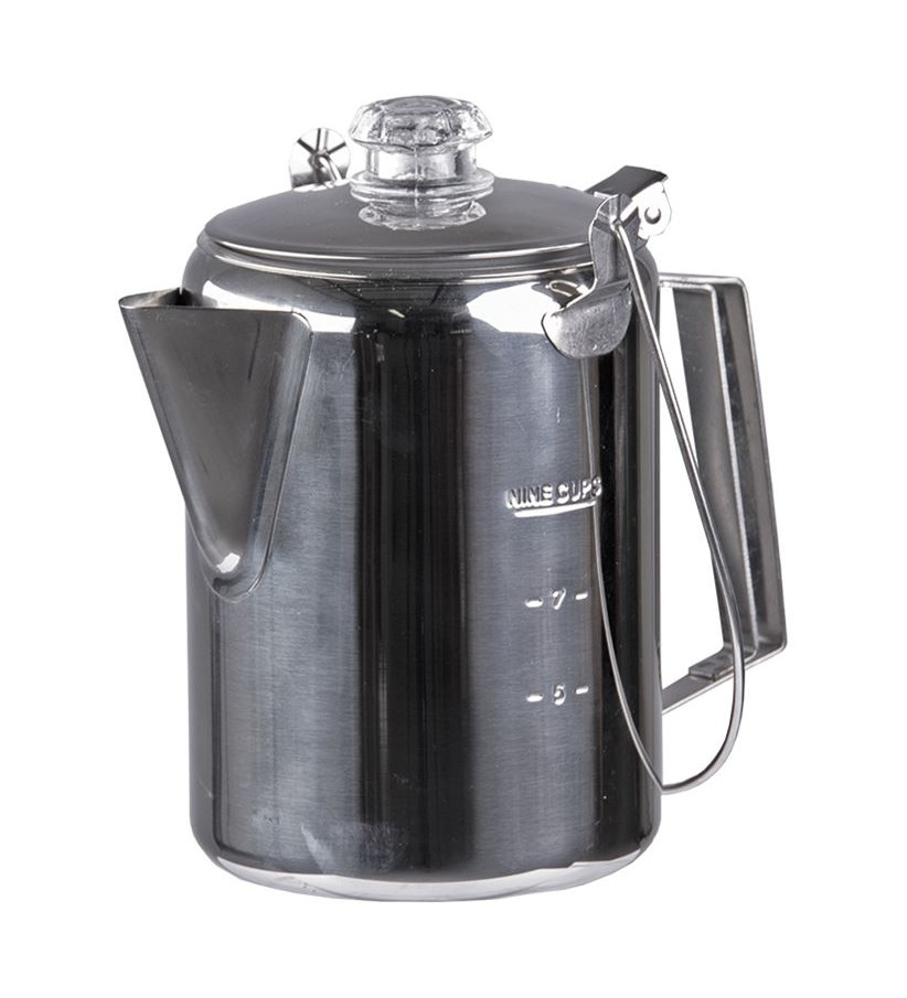 Percolator, 1.3 liters, 6-7 cups, Mil-Tec or Fox Outdoor. A durable stainless steel percolator perfect for camping, outdoor use, or even at home. Very straightforward to use - pour water into the pot, measure coffee grounds into the percolator basket, heat over a campfire, gas stove, open flame, or electric stove, and the water rises into the percolator basket, dripping down to the base. Brewing takes about 7-10 minutes.