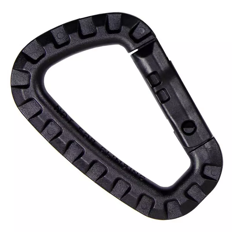 Plastic carabiner hook for securing items and gear, perfect for attaching to backpacks or belt loops.