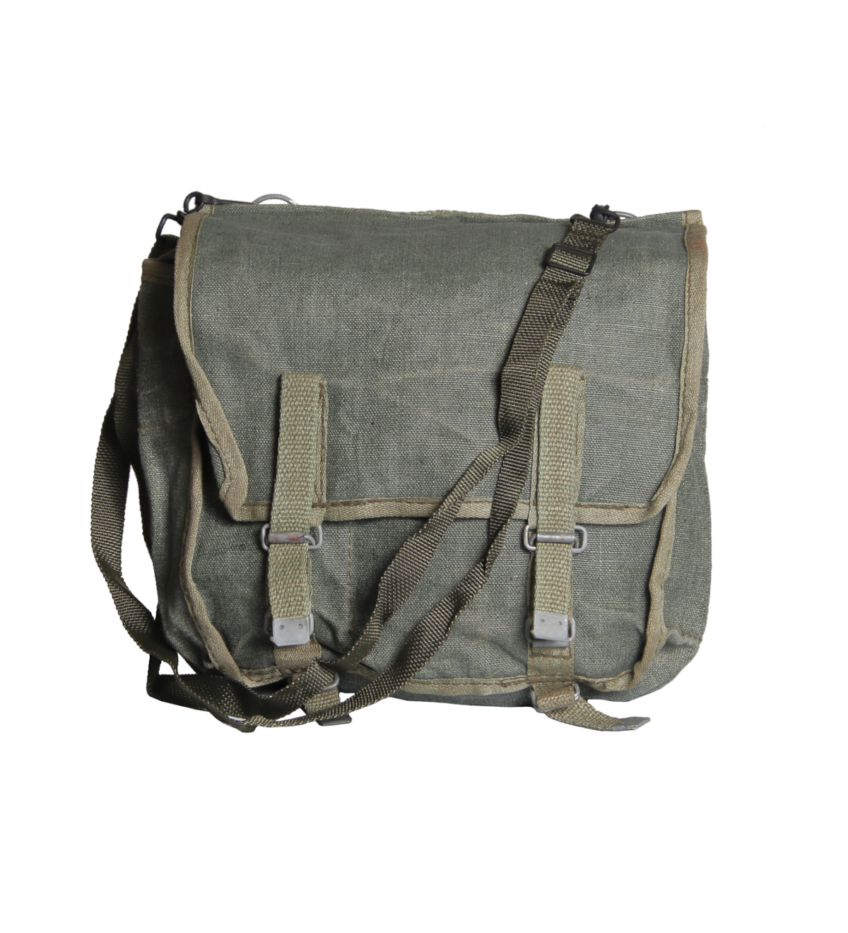 Polish Bread Bag, Surplus. An authentic Polish bread bag from the era of the Kaszuby. Inside the bread bag, there are three small pockets and a main compartment divided into two sections. On the back, there is a carrying handle and lacing, allowing you to easily hang it from your belt. Additionally, it features metal D-rings for attaching a shoulder strap. The bag can also be easily mounted on a bicycle rack.