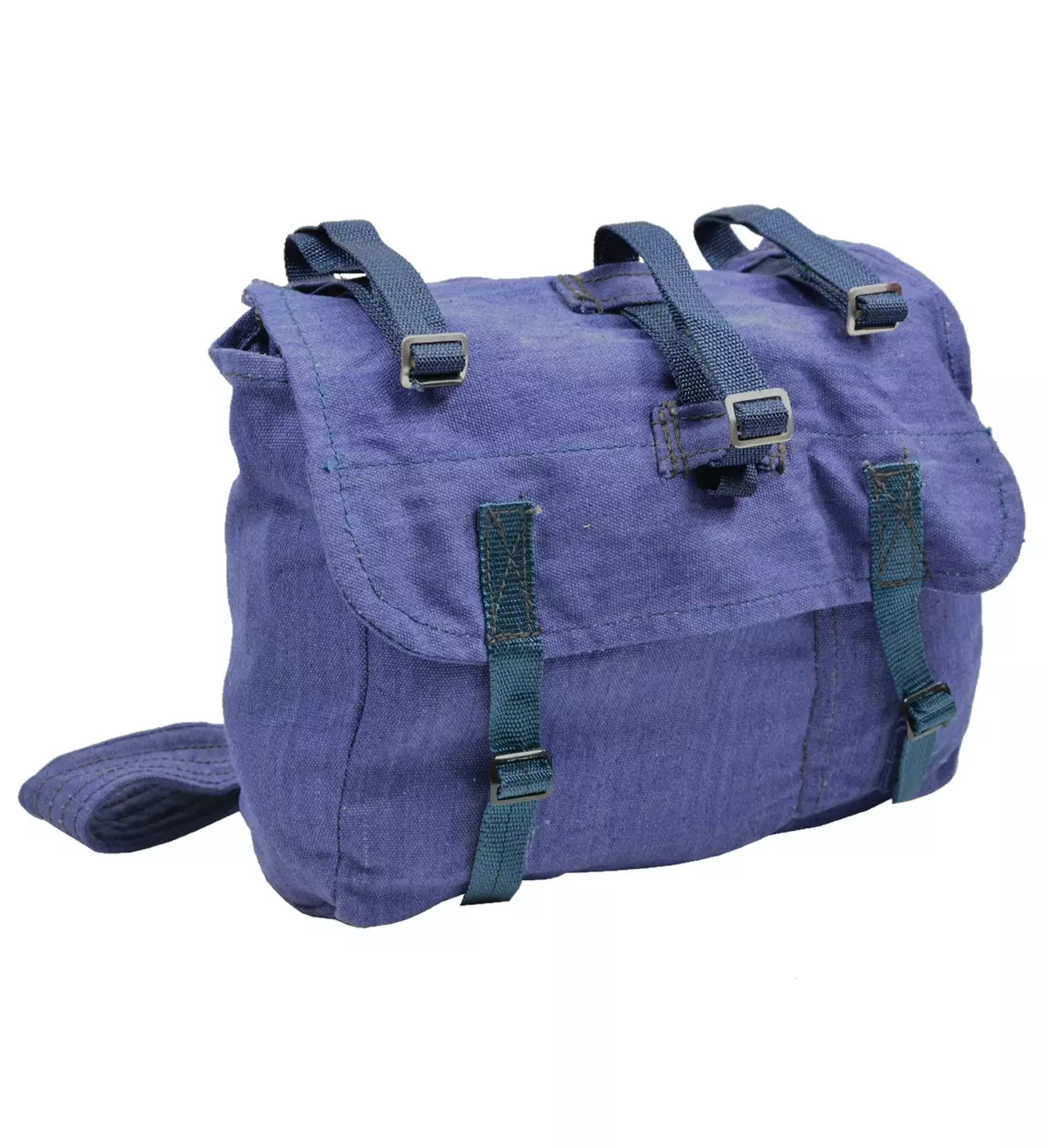 Romanian Bread Bag, Blue, Surplus. Attention!!! Check out this incredibly cool Romanian bread bag, perfect as a shoulder bag! Made from durable cotton fabric with metal buckles on the straps. The interior is divided into two compartments, with adjustable height using the flap's fasteners. Dimensions measure approximately 32 x 28 x 12 cm, making it an excellent size for daily use. The bag features three adjustable straps, two located on top, perfect for securing items like a sleeping pad, and one strap at the front for additional gear like a towel. This bag is ideal for picnics and small excursions.